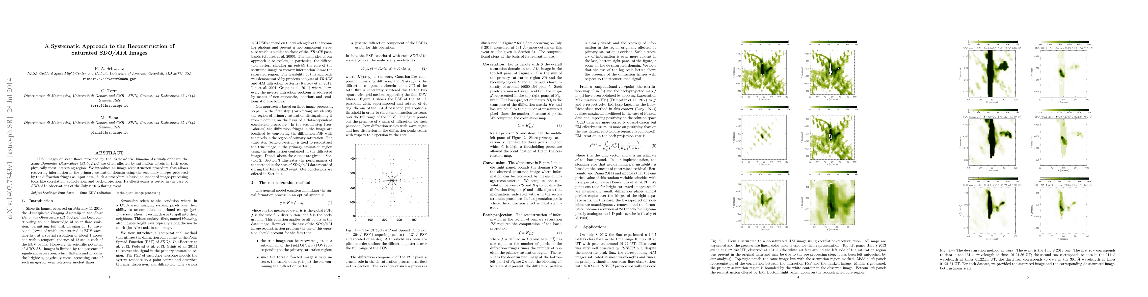 This paper presents a systematic method for reconstructing saturated EUV images from SDO/AIA, utilizing diffraction fringes to recover data from the core of solar flares. The proposed technique employs correlation, convolution, and back-projection, validated through the analysis of the July 8, 2013, flaring event.