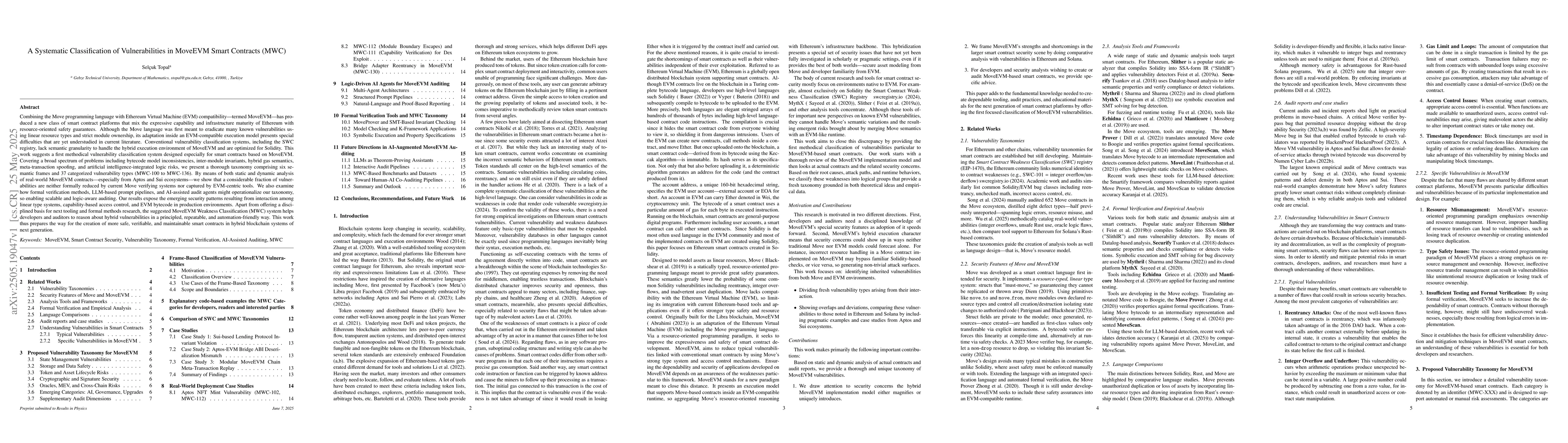 The research introduces the MoveEVM Weakness Classification (MWC) system, a taxonomy for smart contracts built with Move and executed in EVM-compatible environments. It categorizes 37 vulnerability types (MWC-100 to MWC-136) across six semantic frames, analyzing real-world contracts from Aptos and Sui.