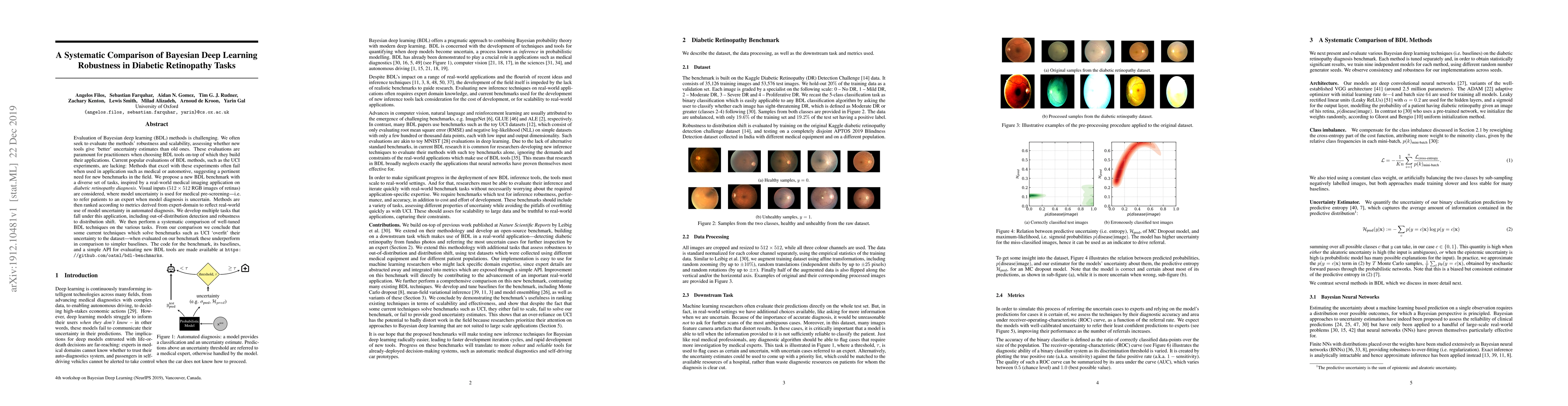 Evaluation of Bayesian deep learning (BDL) methods is challenging. We often seek to evaluate the methods' robustness and scalability, assessing whether new tools give `better' uncertainty estimates than old ones. These evaluations are paramount for practitioners when choosing BDL tools on-top of which they build their applications. Current popular evaluations of BDL methods, such as the UCI experiments, are lacking: Methods that excel with these experiments often fail when used in application such as medical or automotive, suggesting a pertinent need for new benchmarks in the field. We propose a new BDL benchmark with a diverse set of tasks, inspired by a real-world medical imaging application on \emph{diabetic retinopathy diagnosis}. Visual inputs (512x512 RGB images of retinas) are considered, where model uncertainty is used for medical pre-screening---i.e. to refer patients to an expert when model diagnosis is uncertain. Methods are then ranked according to metrics derived from expert-domain to reflect real-world use of model uncertainty in automated diagnosis. We develop multiple tasks that fall under this application, including out-of-distribution detection and robustness to distribution shift. We then perform a systematic comparison of well-tuned BDL techniques on the various tasks. From our comparison we conclude that some current techniques which solve benchmarks such as UCI `overfit' their uncertainty to the dataset---when evaluated on our benchmark these underperform in comparison to simpler baselines. The code for the benchmark, its baselines, and a simple API for evaluating new BDL tools are made available at https://github.com/oatml/bdl-benchmarks.