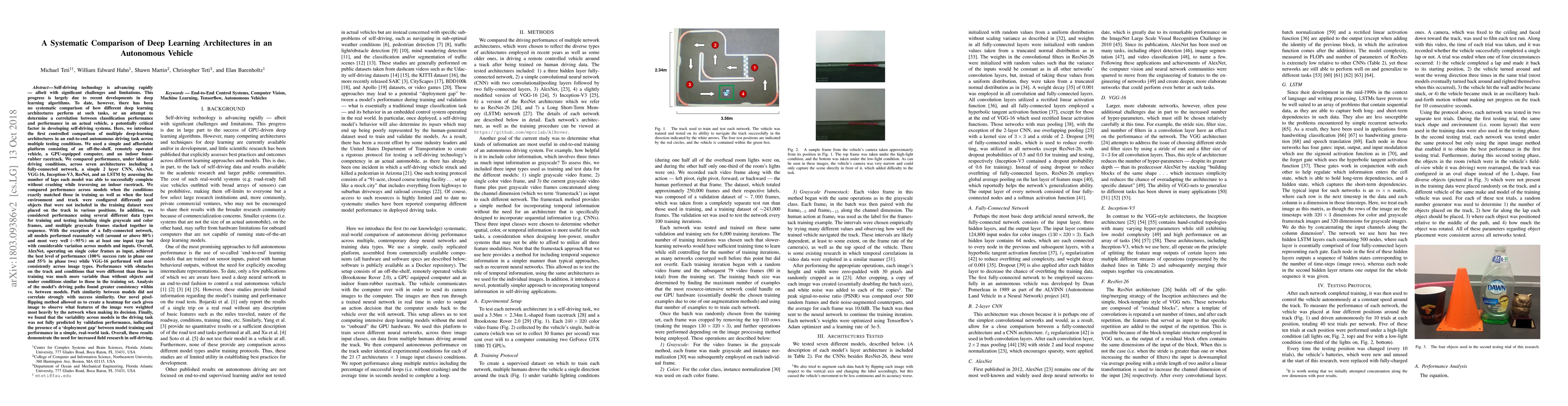 A systematic comparison of deep learning architectures in an autonomous vehicle found that AlexNet and VGG-16 performed well on various input types, while a fully-connected network struggled to match their performance.