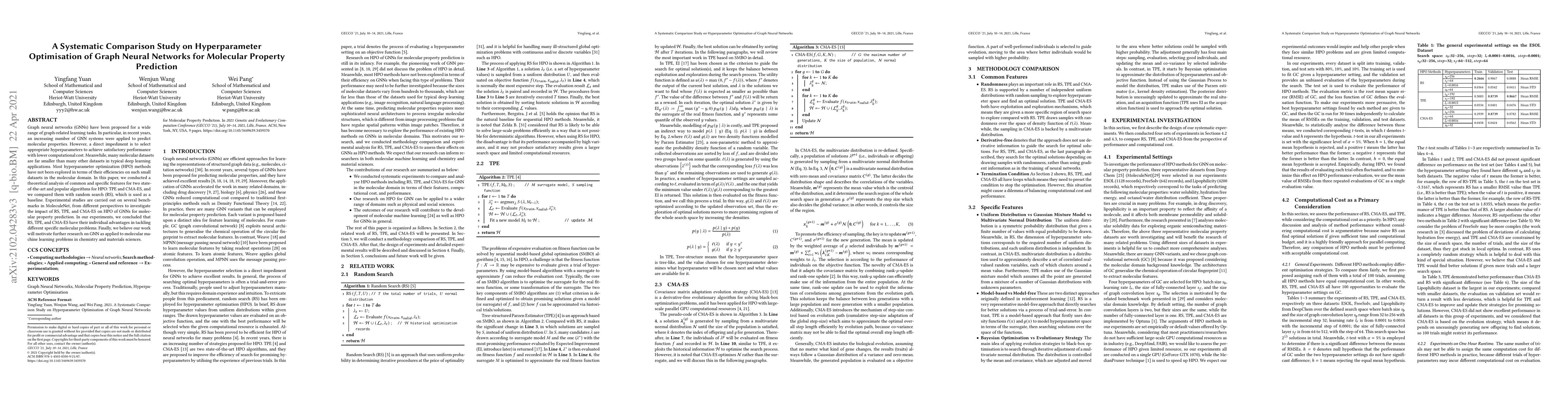 This study compares three hyperparameter optimization methods for graph neural networks in predicting molecular properties: random search, TPE, and CMA-ES. The findings suggest that each method excels in different situations, offering a starting point for further research in molecular machine learning.