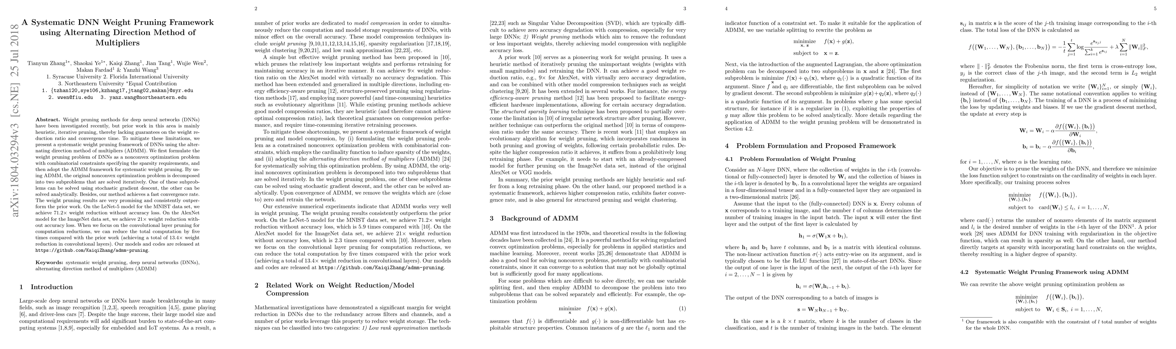 This paper proposes a systematic weight pruning framework for deep neural networks using the alternating direction method of multipliers (ADMM). The method decomposes the nonconvex optimization problem into two subproblems, achieving a fast convergence rate and significant weight reduction without loss in accuracy. Results show 71.2 times weight reduction on LeNet-5 for MNIST and 21 times on AlexNet for ImageNet, with a five times reduction in total computation for convolutional layers.