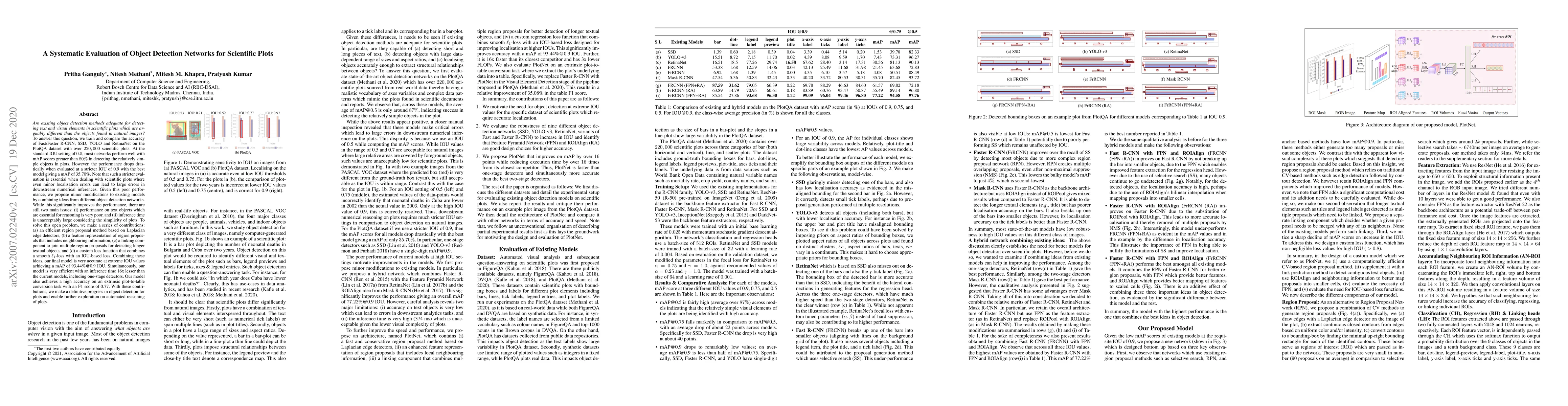 Are existing object detection methods adequate for detecting text and visual elements in scientific plots which are arguably different than the objects found in natural images? To answer this question, we train and compare the accuracy of various SOTA object detection networks on the PlotQA dataset. At the standard IOU setting of 0.5, most networks perform well with mAP scores greater than 80% in detecting the relatively simple objects in plots. However, the performance drops drastically when evaluated at a stricter IOU of 0.9 with the best model giving a mAP of 35.70%. Note that such a stricter evaluation is essential when dealing with scientific plots where even minor localisation errors can lead to large errors in downstream numerical inferences. Given this poor performance, we propose minor modifications to existing models by combining ideas from different object detection networks. While this significantly improves the performance, there are still 2 main issues: (i) performance on text objects which are essential for reasoning is very poor, and (ii) inference time is unacceptably large considering the simplicity of plots. To solve this open problem, we make a series of contributions: (a) an efficient region proposal method based on Laplacian edge detectors, (b) a feature representation of region proposals that includes neighbouring information, (c) a linking component to join multiple region proposals for detecting longer textual objects, and (d) a custom loss function that combines a smooth L1-loss with an IOU-based loss. Combining these ideas, our final model is very accurate at extreme IOU values achieving a mAP of 93.44%@0.9 IOU. Simultaneously, our model is very efficient with an inference time 16x lesser than the current models, including one-stage detectors. With these contributions, we enable further exploration on the automated reasoning of plots.