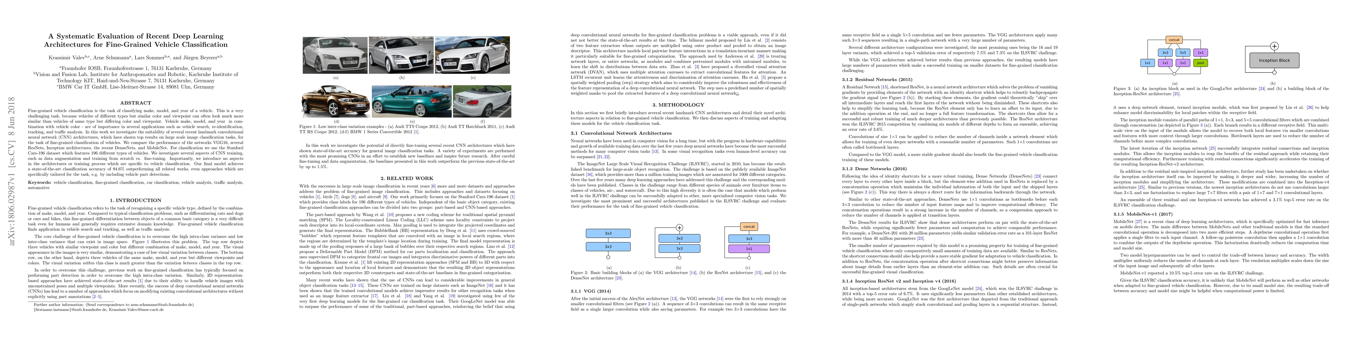 A recent deep learning architecture comparison study found that VGG16, ResNets, Inception architectures, DenseNets, and MobileNet achieved state-of-the-art 94.6% accuracy for fine-grained vehicle classification.