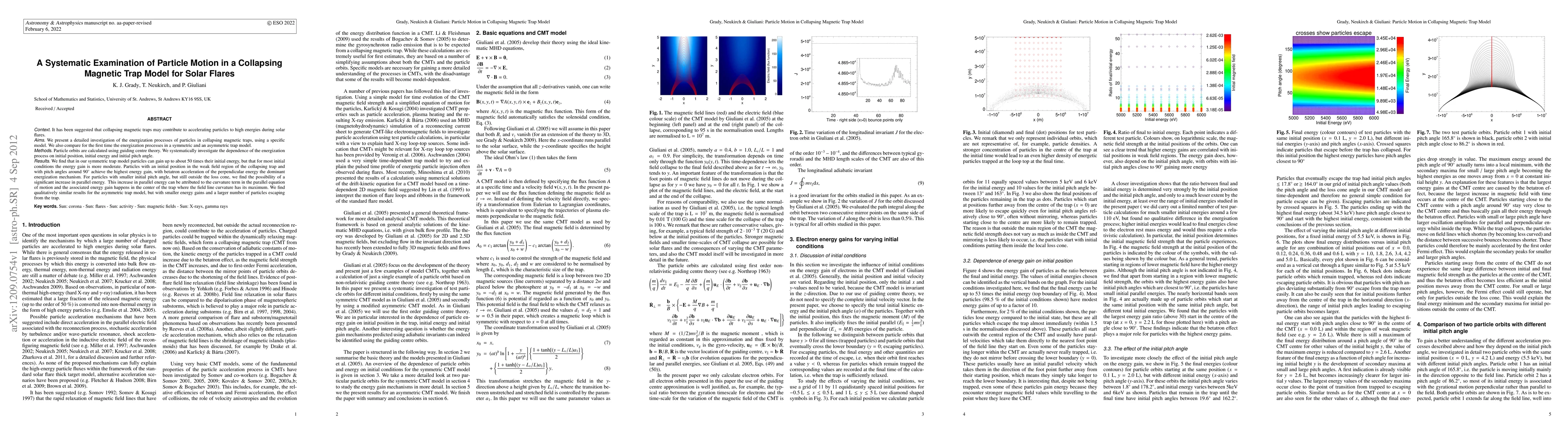 This study investigates the energization processes of particles in collapsing magnetic traps during solar flares, finding that particles can gain up to 50 times their initial energy, with betatron acceleration being the dominant mechanism in symmetric traps. The asymmetric trap model shows smaller energy gains and more particle escape.