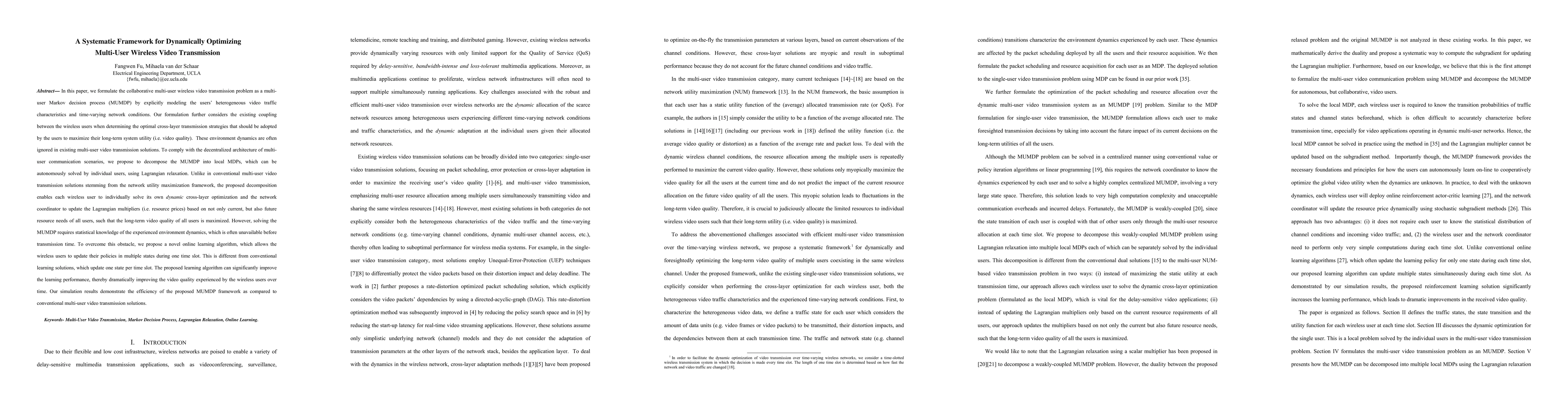 This paper proposes a systematic framework for optimizing multi-user wireless video transmission by modeling it as a multi-user Markov decision process (MUMDP) that accounts for dynamic network conditions and user heterogeneity. The framework decomposes the MUMDP into local MDPs using Lagrangian relaxation, enabling decentralized optimization and improved long-term video quality through an online learning algorithm that updates policies in multiple states per time slot.