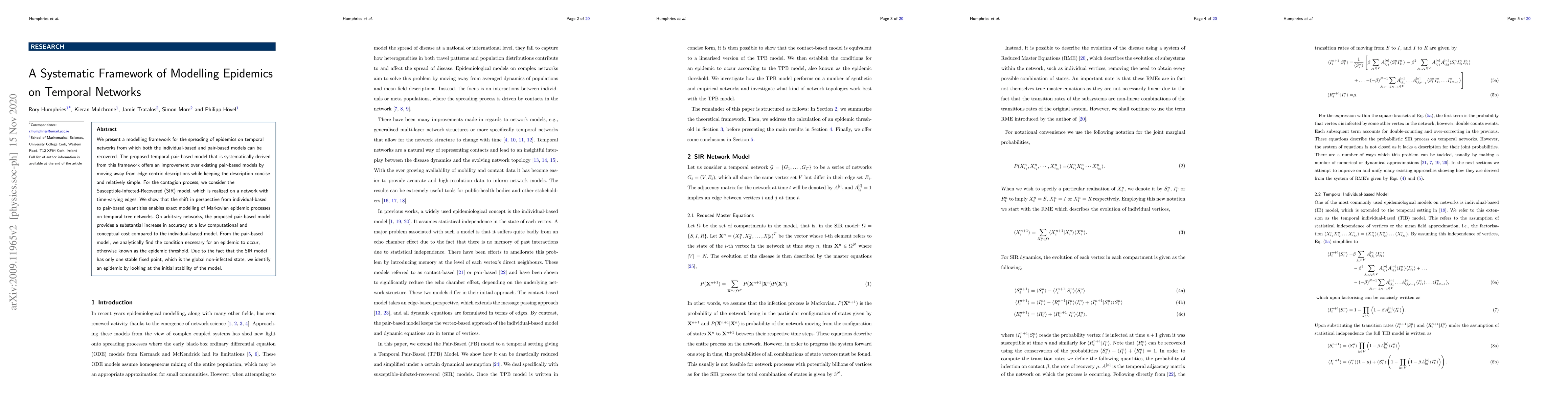 This paper introduces a systematic framework for modelling epidemics on temporal networks, proposing a temporal pair-based model that enhances existing pair-based models by simplifying the contagion process while maintaining accuracy. The framework enables exact modelling of Markovian epidemic processes and identifies the epidemic threshold through the initial stability of the Susceptible-Infected-Recovered (SIR) model.