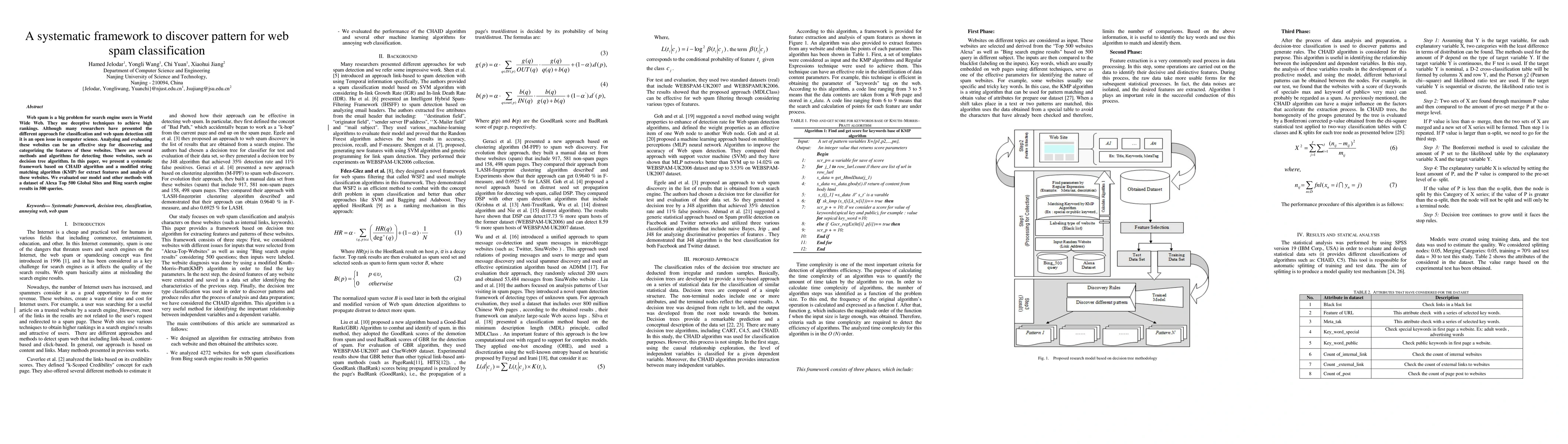 This paper proposes a systematic framework for web spam classification using the CHAID algorithm and a modified KMP string matching algorithm to extract and analyze features. The framework is evaluated against a dataset of Alexa Top 500 Global Sites and Bing search results, demonstrating its effectiveness in detecting web spam.