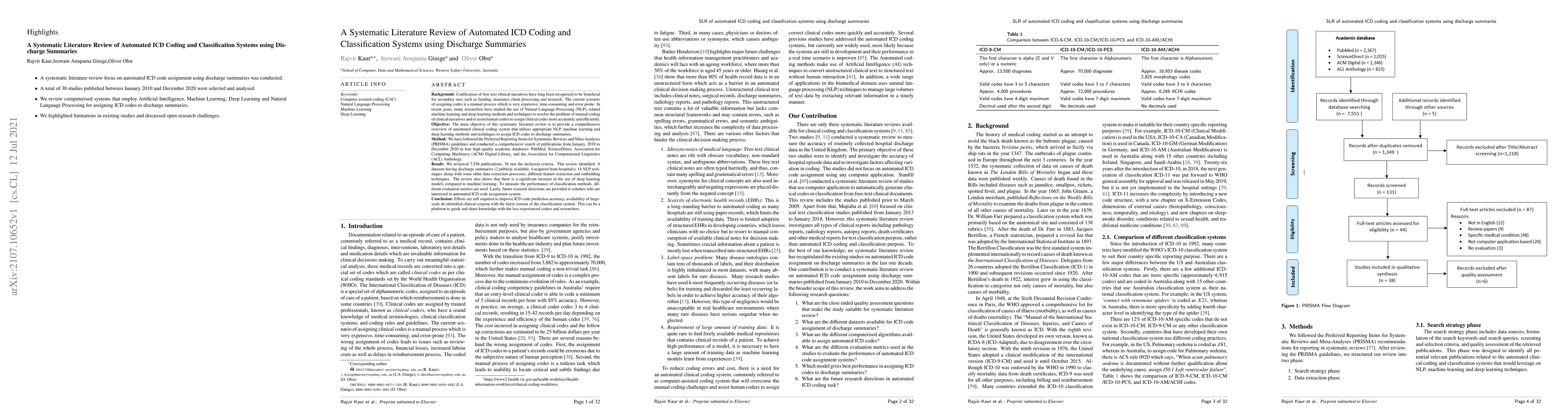 This systematic literature review examines automated ICD coding systems using NLP, ML, and DL techniques to improve the efficiency and accuracy of coding clinical discharge summaries. The review identifies key datasets, methodologies, and evaluation metrics, highlighting the need for more accurate predictions and larger clinical corpora.