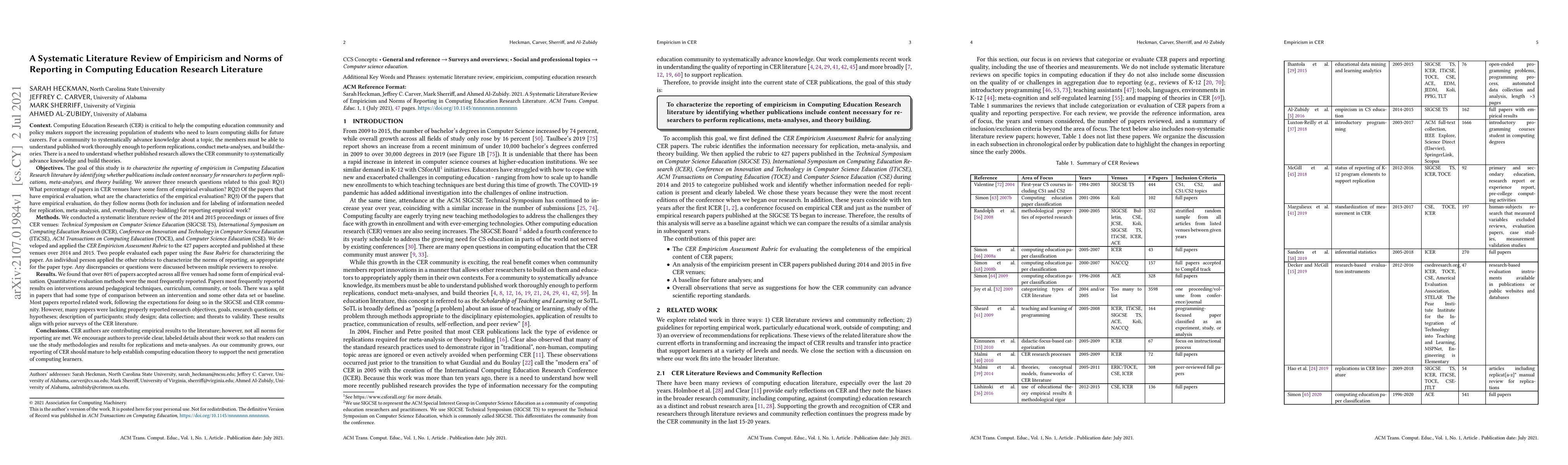 This study systematically reviews 427 papers from five computing education research venues to assess the empiricism and reporting norms in the literature. Over 80% of papers included empirical evaluations, primarily quantitative, focusing on pedagogical techniques, curriculum, community, or tools. However, many lacked detailed reporting of research objectives, design, and validity, suggesting a need for improved norms to support replication and meta-analysis.