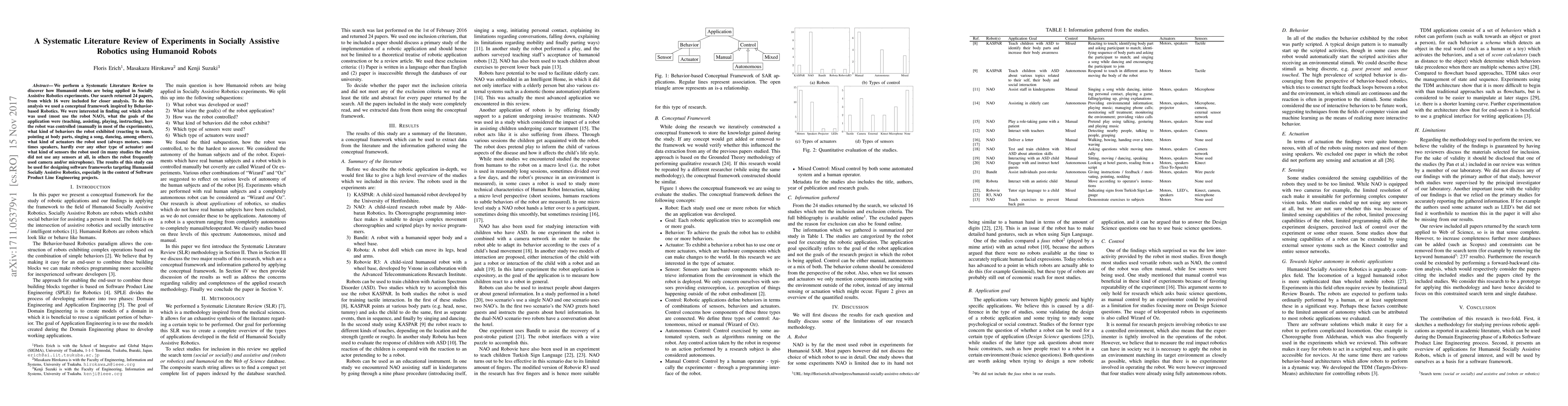 This paper systematically reviews 24 papers on Humanoid robots in Socially Assistive Robotics, analyzing 16 in detail to identify common robot types (most use NAO), goals (teaching, assisting, playing), control methods (mostly manual), behaviors (touch reactions, dancing), and sensor/actuator usage (motors and cameras most common). The findings inform software framework design for Humanoid Socially Assistive Robotics.