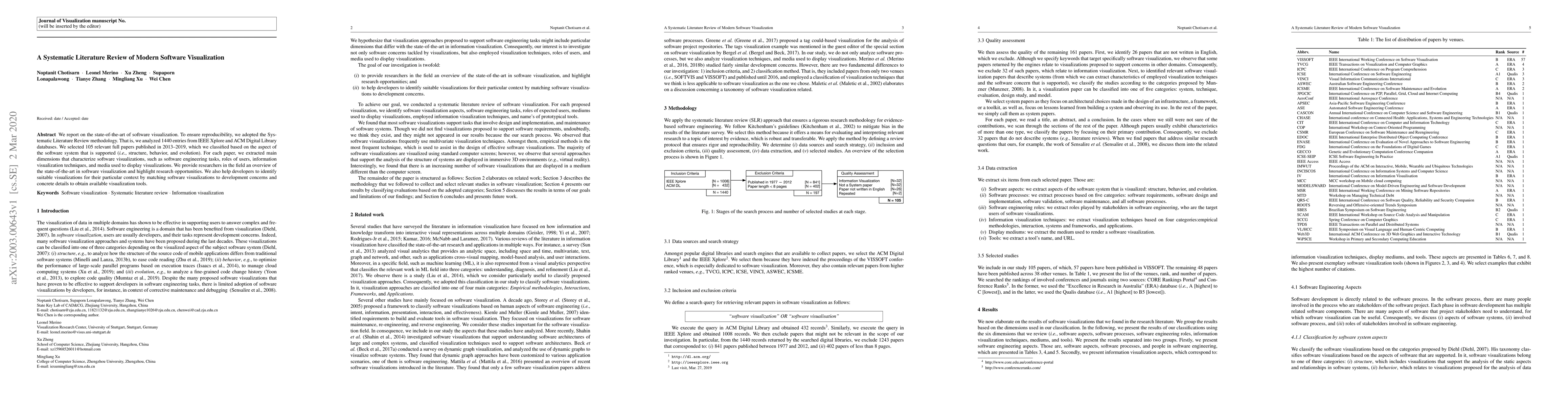 This paper systematically reviews modern software visualization techniques, analyzing 105 relevant papers published between 2013-2019 to classify and characterize various visualizations based on software engineering tasks and user roles. It provides an overview of current trends and identifies research opportunities and practical tools for developers.