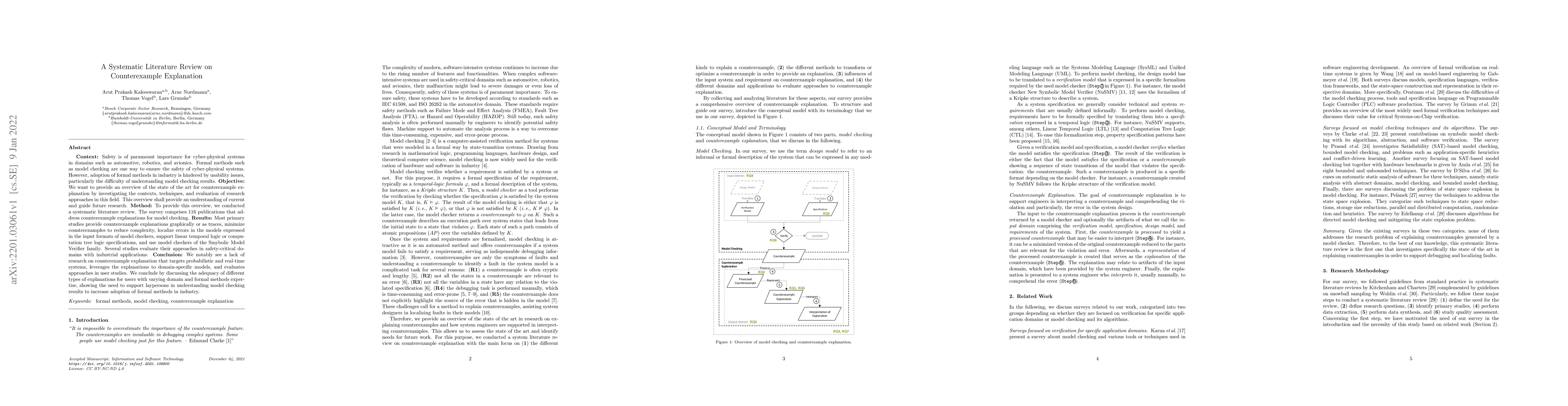 This systematic literature review investigates current research on counterexample explanations for model checking in safety-critical domains. It finds that most studies focus on graphical explanations, minimization techniques, and evaluations in industrial contexts, but highlights a need for research targeting probabilistic and real-time systems, domain-specific models, and user study evaluations.