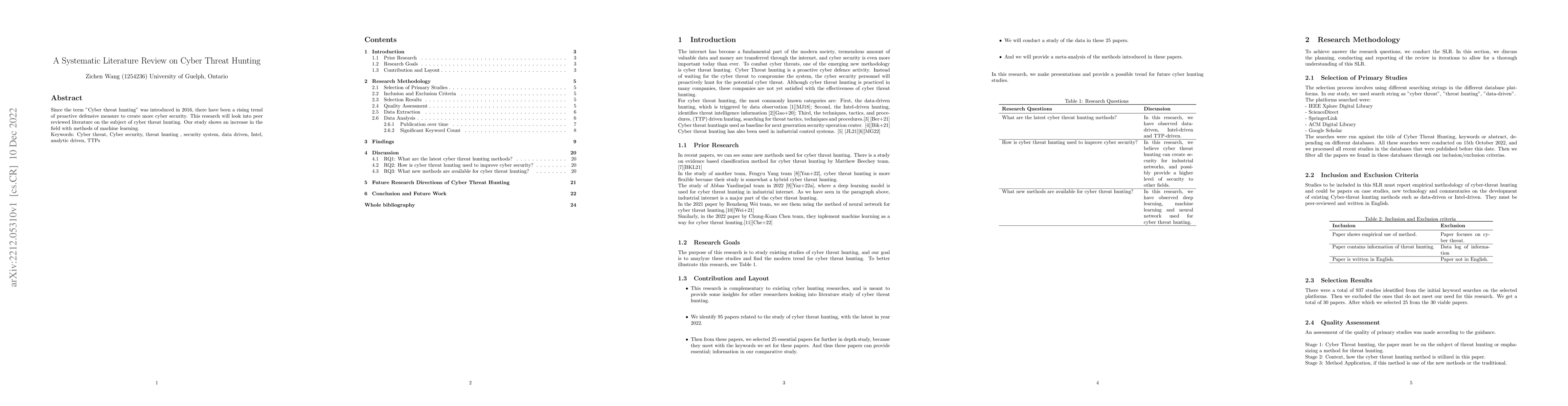 Since the term "Cyber threat hunting" was introduced in 2016, there have been a rising trend of proactive defensive measure to create more cyber security. This research will look into peer reviewed literature on the subject of cyber threat hunting. Our study shows an increase in the field with methods of machine learning.\\ Keywords: Cyber threat, Cyber security, threat hunting , security system, data driven, Intel, analytic driven, TTPs