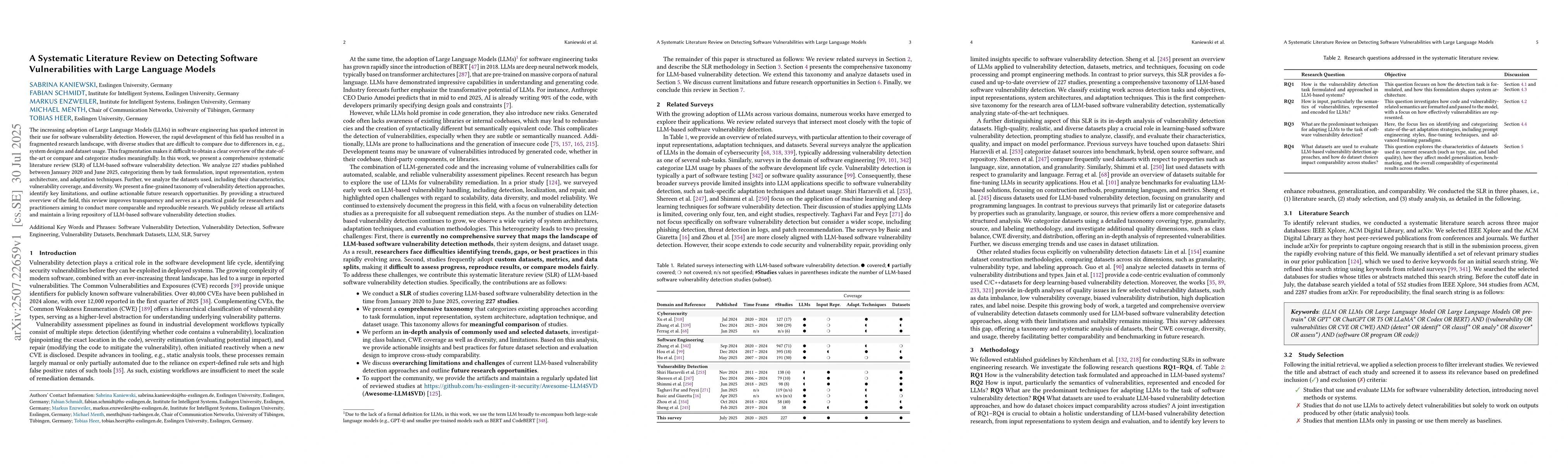 The paper introduces a comprehensive taxonomy and analysis of LLM-based software vulnerability detection approaches, along with a living repository of related studies.