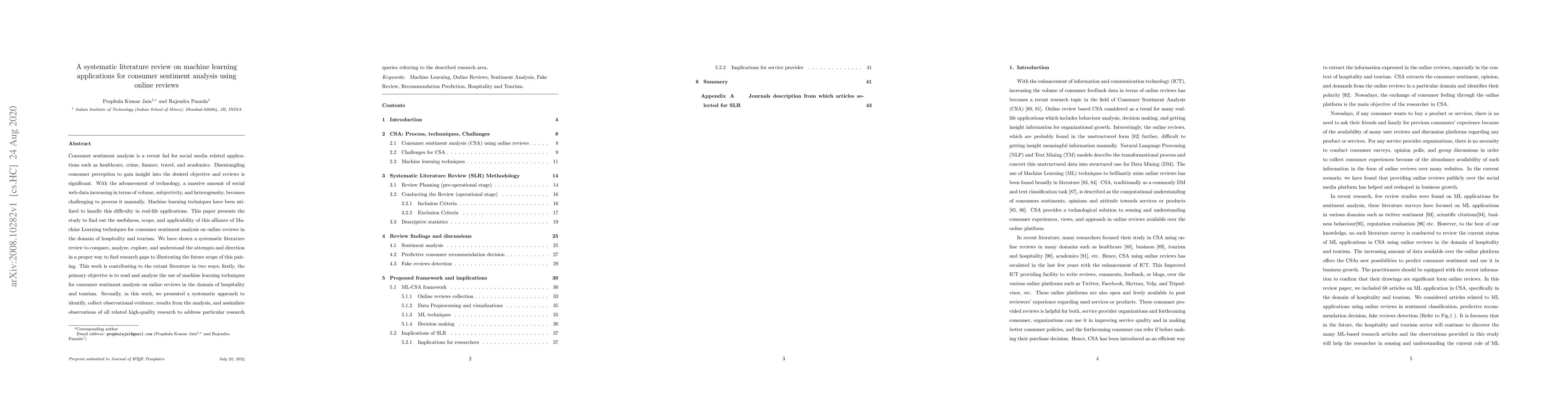 This paper conducts a systematic literature review to assess the application of machine learning techniques for analyzing consumer sentiment in online reviews, focusing on the hospitality and tourism sectors. It identifies research gaps and future directions by comparing and synthesizing existing studies to highlight the effectiveness and scope of these techniques.