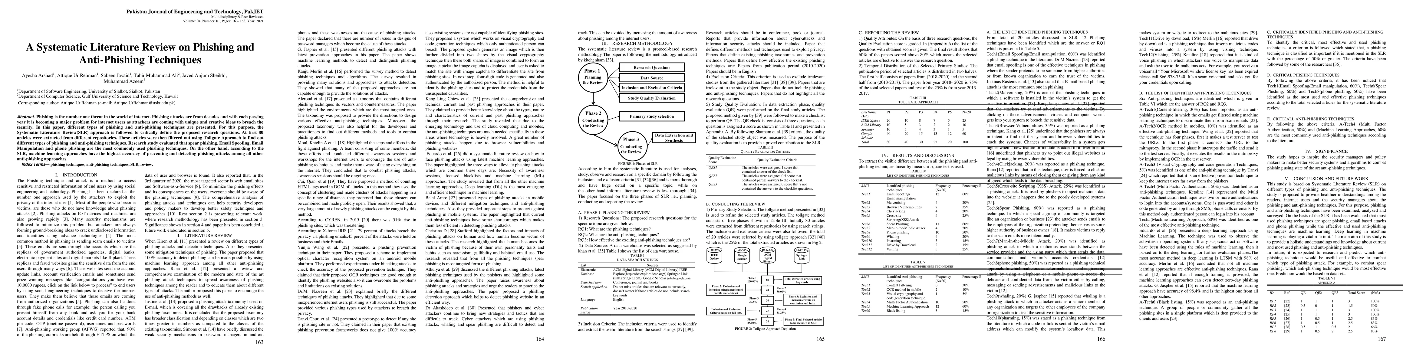 This paper conducts a systematic literature review on phishing and anti-phishing techniques, identifying spear phishing, email spoofing, email manipulation, and phone phishing as prevalent methods. Machine learning approaches are found to be the most effective in detecting and preventing phishing attacks.