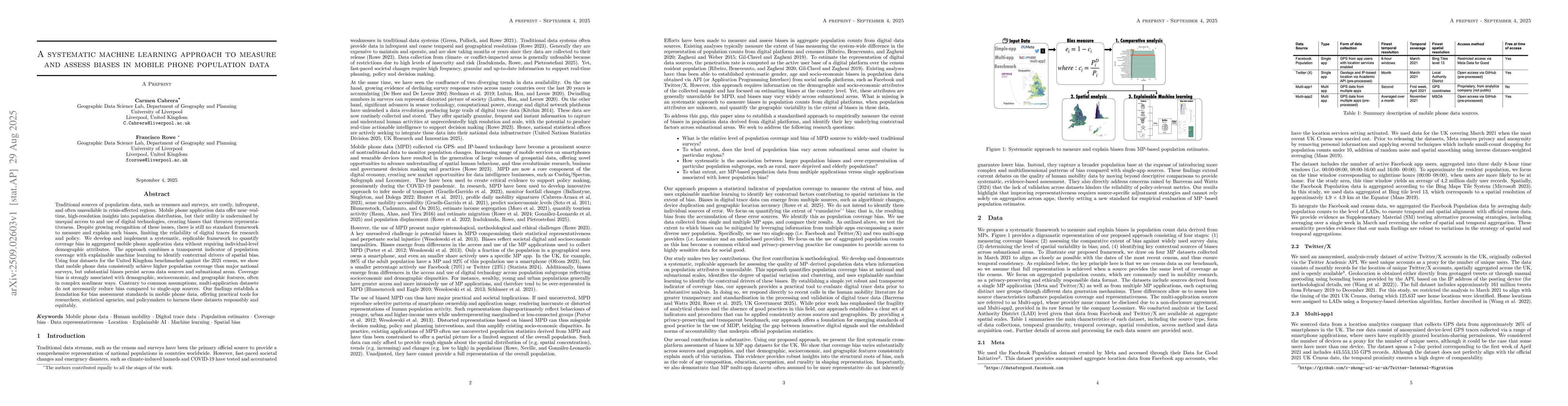 Traditional sources of population data, such as censuses and surveys, are costly, infrequent, and often unavailable in crisis-affected regions. Mobile phone application data offer near real-time, high-resolution insights into population distribution, but their utility is undermined by unequal access to and use of digital technologies, creating biases that threaten representativeness. Despite growing recognition of these issues, there is still no standard framework to measure and explain such biases, limiting the reliability of digital traces for research and policy. We develop and implement a systematic, replicable framework to quantify coverage bias in aggregated mobile phone application data without requiring individual-level demographic attributes. The approach combines a transparent indicator of population coverage with explainable machine learning to identify contextual drivers of spatial bias. Using four datasets for the United Kingdom benchmarked against the 2021 census, we show that mobile phone data consistently achieve higher population coverage than major national surveys, but substantial biases persist across data sources and subnational areas. Coverage bias is strongly associated with demographic, socioeconomic, and geographic features, often in complex nonlinear ways. Contrary to common assumptions, multi-application datasets do not necessarily reduce bias compared to single-app sources. Our findings establish a foundation for bias assessment standards in mobile phone data, offering practical tools for researchers, statistical agencies, and policymakers to harness these datasets responsibly and equitably.