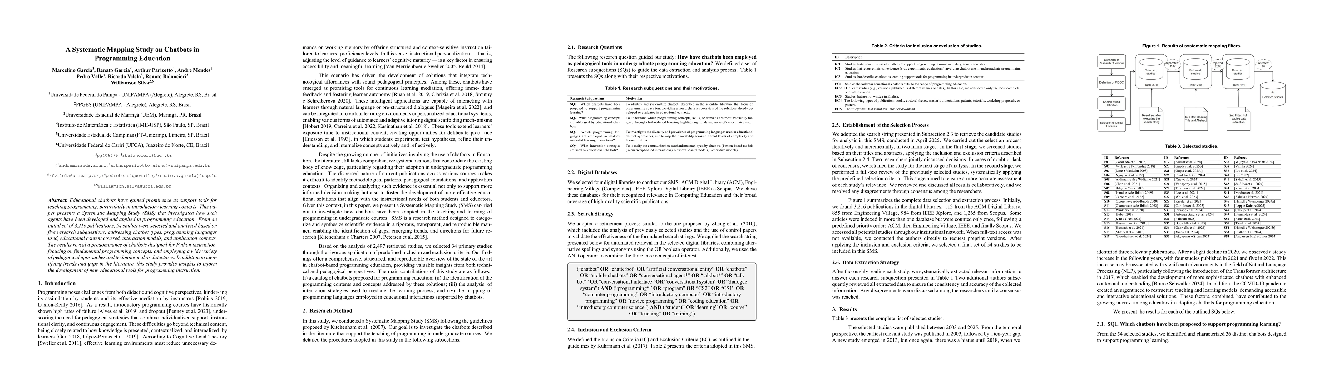 Educational chatbots have gained prominence as support tools for teaching programming, particularly in introductory learning contexts. This paper presents a Systematic Mapping Study (SMS) that investigated how such agents have been developed and applied in programming education. From an initial set of 3,216 publications, 54 studies were selected and analyzed based on five research subquestions, addressing chatbot types, programming languages used, educational content covered, interaction models, and application contexts. The results reveal a predominance of chatbots designed for Python instruction, focusing on fundamental programming concepts, and employing a wide variety of pedagogical approaches and technological architectures. In addition to identifying trends and gaps in the literature, this study provides insights to inform the development of new educational tools for programming instruction.