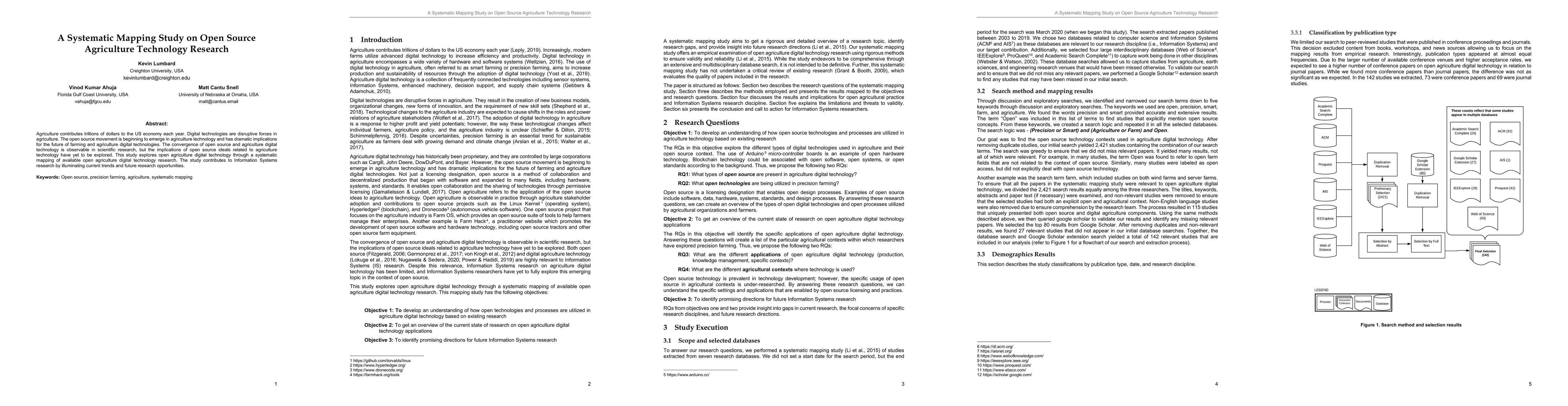 Agriculture contributes trillions of dollars to the US economy each year. Digital technologies are disruptive forces in agriculture. The open source movement is beginning to emerge in agriculture technology and has dramatic implications for the future of farming and agriculture digital technologies. The convergence of open source and agriculture digital technology is observable in scientific research, but the implications of open source ideals related to agriculture technology have yet to be explored. This study explores open agriculture digital technology through a systematic mapping of available open agriculture digital technology research. The study contributes to Information Systems research by illuminating current trends and future research opportunities.