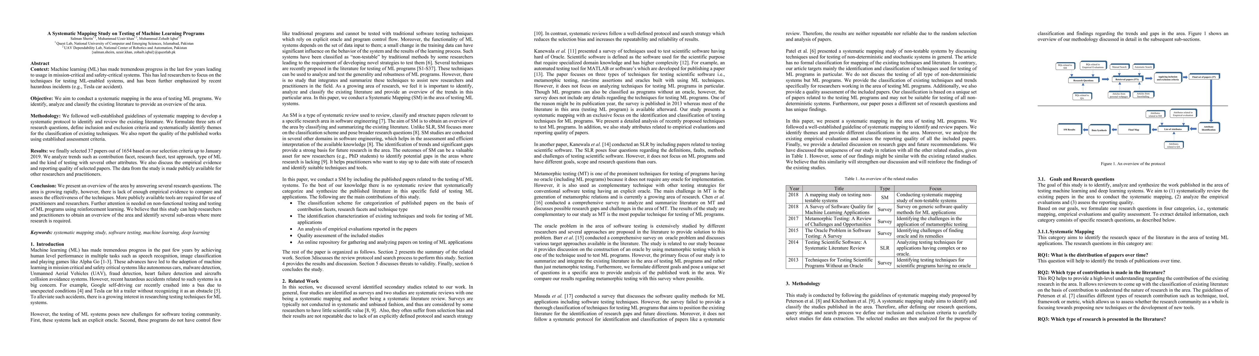 This paper systematically maps the literature on testing machine learning programs, identifying and classifying 37 papers from 1,654 reviewed. It highlights trends and gaps, noting a rapid growth but insufficient empirical evidence and a need for more tools and attention to non-functional testing and reinforcement learning.