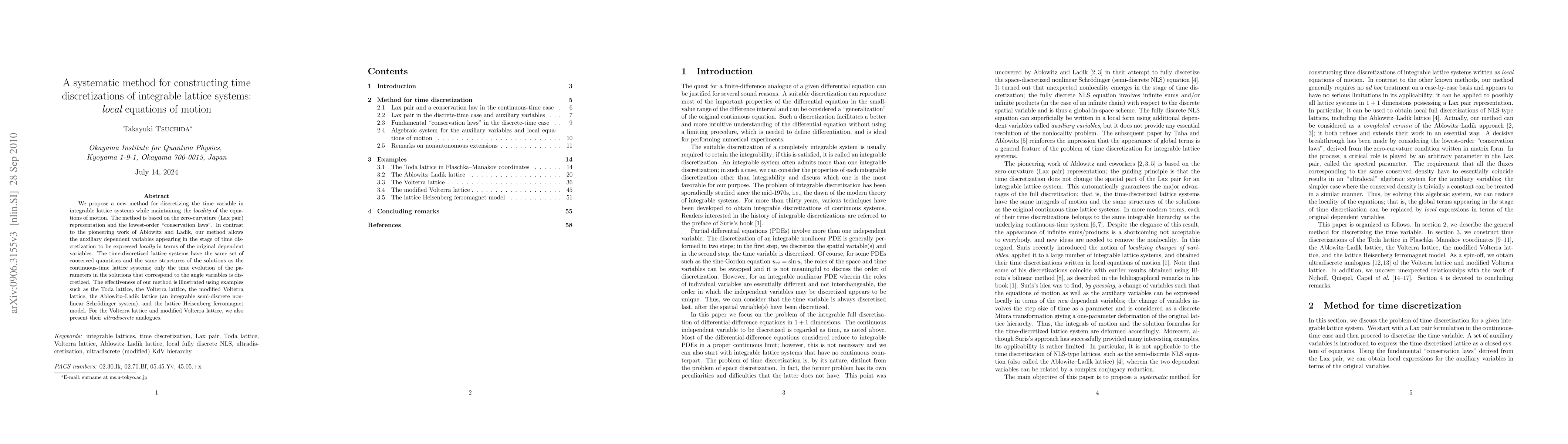 This paper proposes a novel method for time discretization in integrable lattice systems that preserves the locality of the equations of motion, based on the zero-curvature representation and conservation laws. The method maintains the same conserved quantities and solution structures as the continuous-time systems, illustrated through examples including the Toda and Volterra lattices.