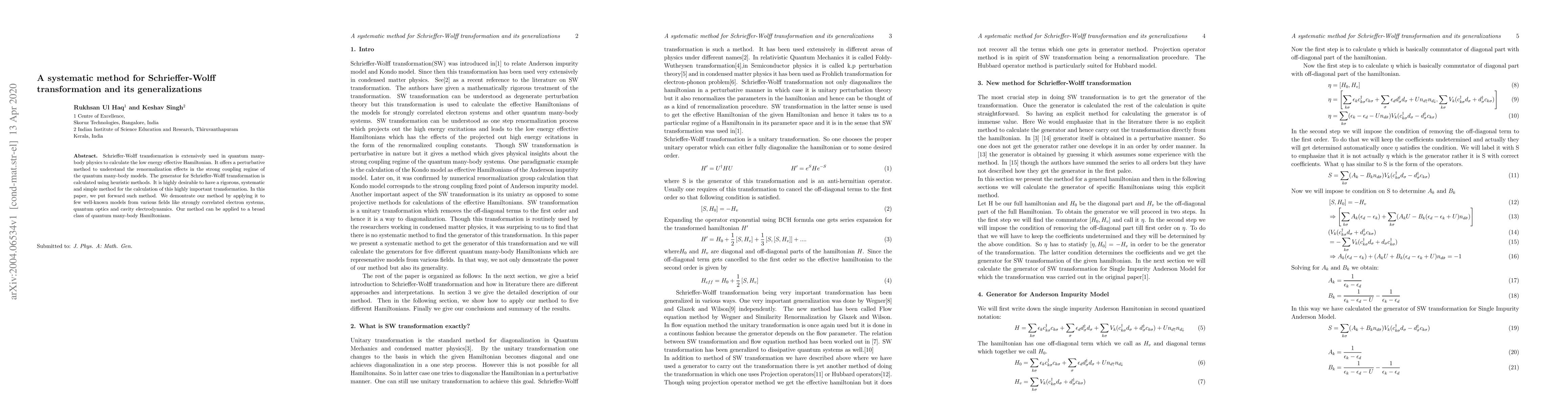 This paper presents a systematic method for the Schrieffer-Wolff transformation, which simplifies the calculation of its generator. The proposed approach is demonstrated on several well-known models from quantum many-body physics, showing its applicability to a wide range of quantum systems.