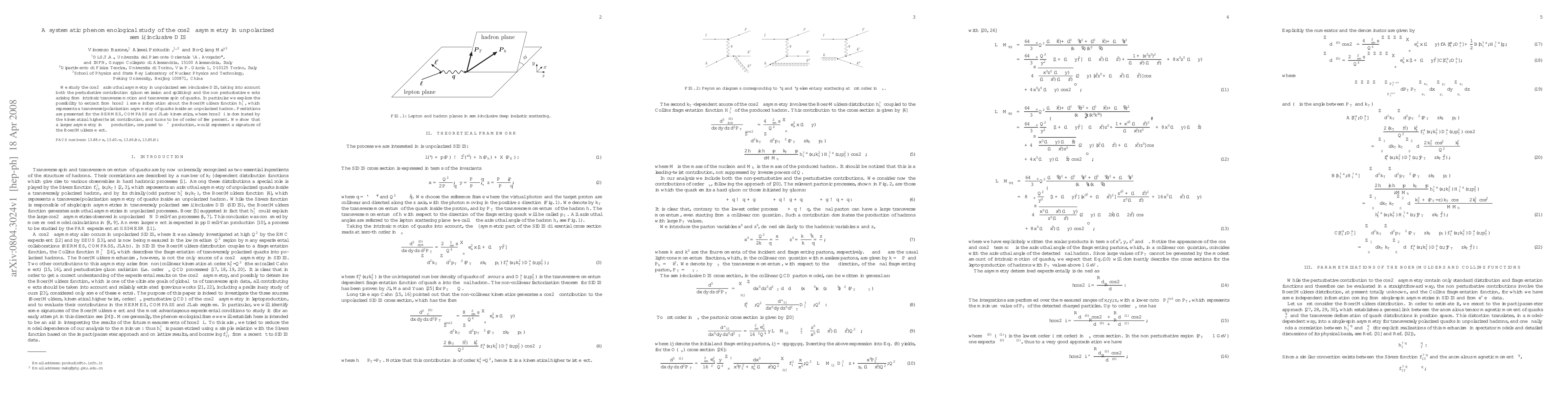 We study the $\cos 2 \phi$ azimuthal asymmetry in unpolarized semi-inclusive DIS, taking into account both the perturbative contribution (gluon emission and splitting) and the non perturbative effects arising from intrinsic transverse motion and transverse spin of quarks. In particular we explore the possibility to extract from $<\cos 2 \phi>$ some information about the Boer--Mulders function $h_1^{\perp}$, which represents a transverse--polarization asymmetry of quarks inside an unpolarized hadron. Predictions are presented for the HERMES, COMPASS and JLab kinematics, where $<\cos 2 \phi>$ is dominated by the kinematical higher--twist contribution, and turns to be of order of few percent. We show that a larger asymmetry in $\pi^-$ production, compared to $\pi^+$ production, would represent a signature of the Boer--Mulders effect.