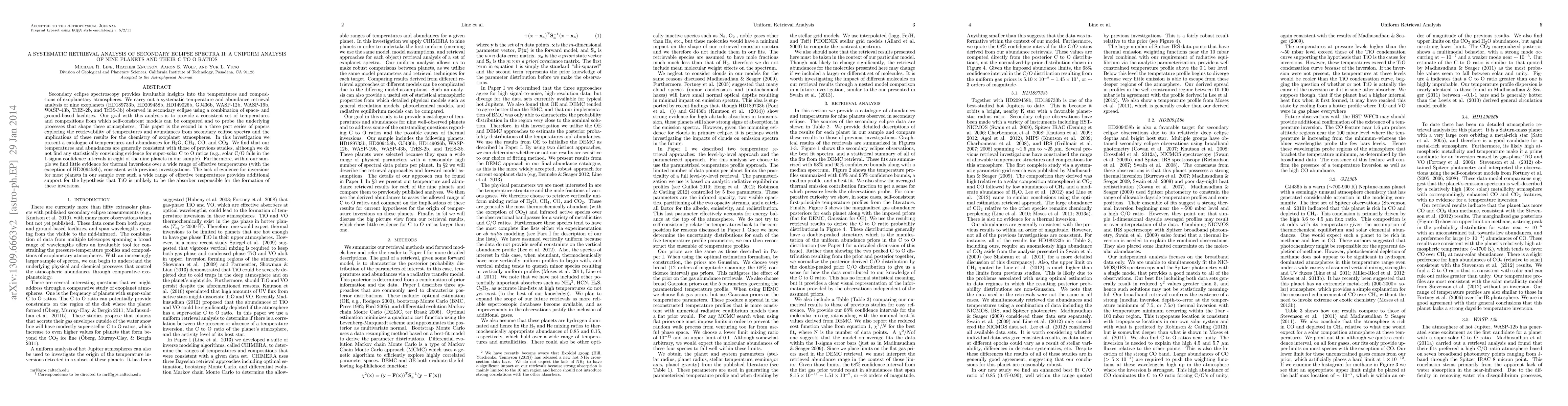 This study systematically analyzes secondary eclipse spectra of nine exoplanets to retrieve temperatures and compositions, focusing on C to O ratios. The results show consistent temperatures and abundances with previous studies, finding no evidence for super-solar C to O ratios in eight planets, and little evidence for thermal inversions across a range of temperatures, supporting the hypothesis that TiO is unlikely to cause these inversions.