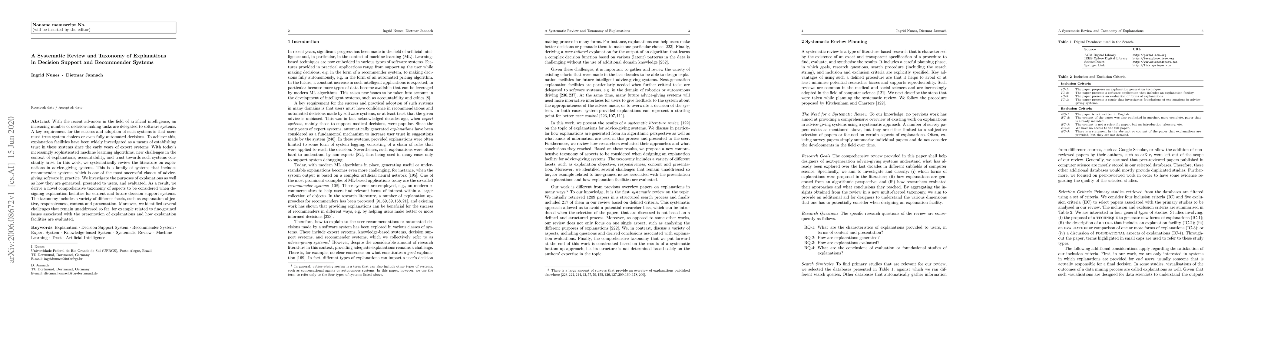 This paper systematically reviews literature on explanations in decision support and recommender systems, aiming to establish trust in AI-driven choices. It proposes a comprehensive taxonomy detailing various facets of explanation design, highlighting challenges like fine-grained presentation and evaluation of explanations.