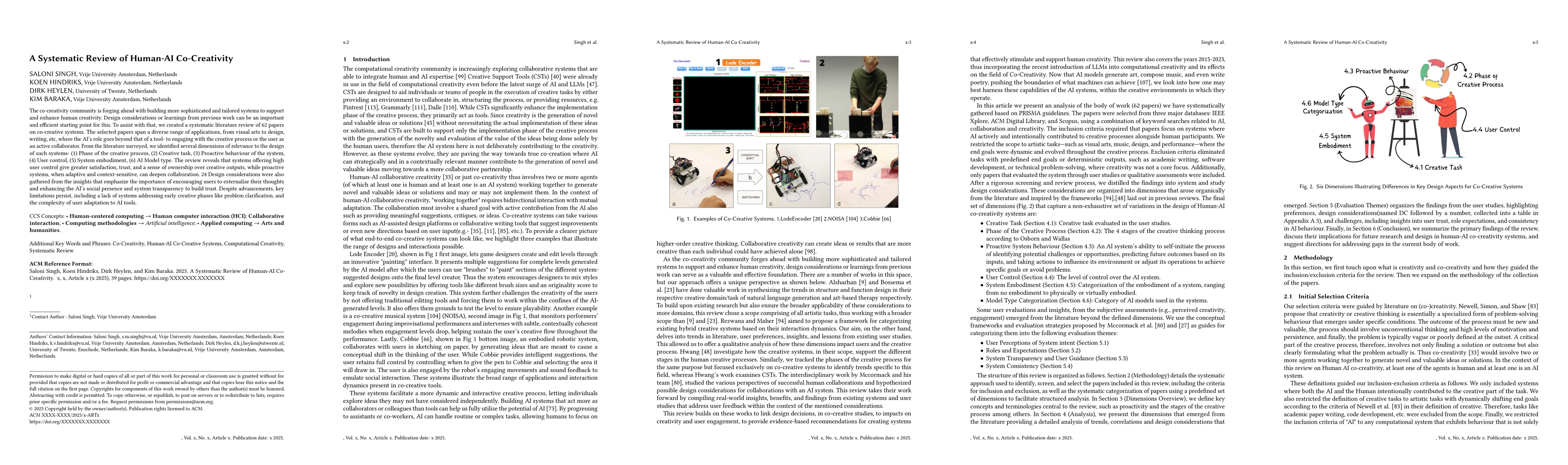 This systematic review of 62 papers on co-creative AI systems identifies key design dimensions like user control, system proactivity, and AI model type. High user control enhances satisfaction and trust; proactive, adaptive systems boost collaboration. The review also highlights 24 design considerations, noting the importance of user thought externalization and system transparency. Despite progress, gaps exist in supporting early creative phases and user adaptation to AI.
