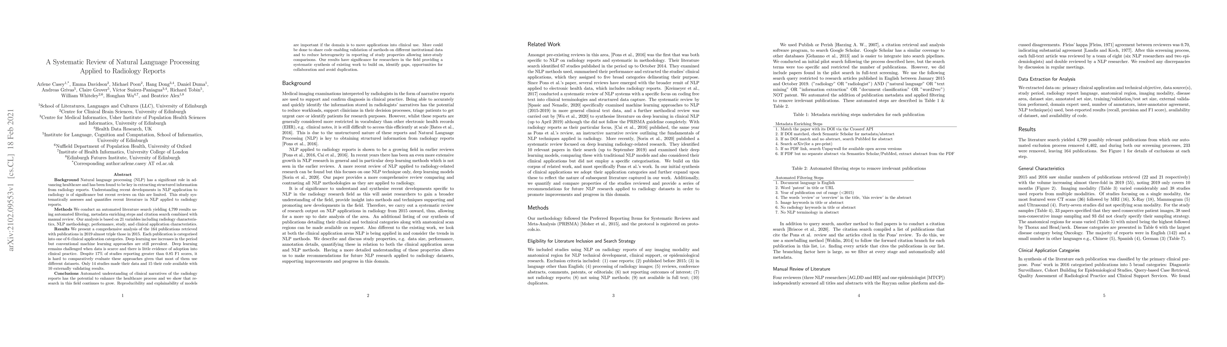 This systematic review analyzes recent literature on NLP applications in radiology reports, identifying 164 publications categorized into six clinical application areas. While deep learning use is on the rise, conventional machine learning remains common, and reproducibility and explainability remain challenges for clinical adoption.