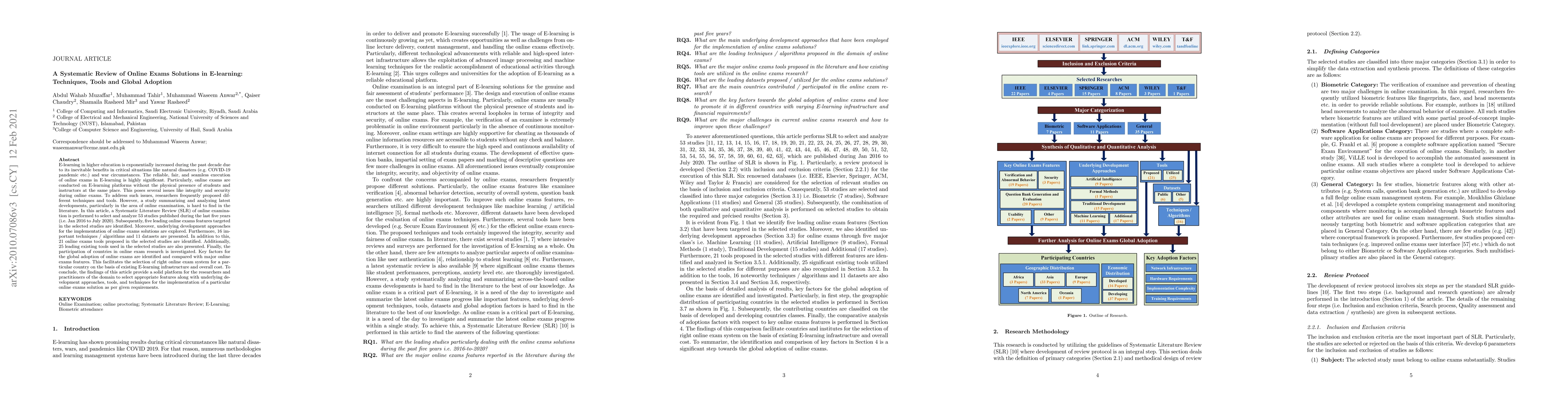 E-learning in higher education is exponentially increased during the past decade due to its inevitable benefits in critical situations like natural disasters, and pandemic. The reliable, fair, and seamless execution of online exams in E-learning is highly significant. Particularly, online exams are conducted on E-learning platforms without the physical presence of students and instructors at the same place. This poses several issues like integrity and security during online exams. To address such issues, researchers frequently proposed different techniques and tools. However, a study summarizing and analyzing latest developments, particularly in the area of online examination, is hard to find in the literature. In this article, an SLR for online examination is performed to select and analyze 53 studies published during the last five years. Subsequently, five leading online exams features targeted in the selected studies are identified and underlying development approaches for the implementation of online exams solutions are explored. Furthermore, 16 important techniques and 11 datasets are presented. In addition, 21 online exams tools proposed in the selected studies are identified. Additionally, 25 leading existing tools used in the selected studies are also presented. Finally, the participation of countries in online exam research is investigated. Key factors for the global adoption of online exams are identified and investigated. This facilitates the selection of right online exam system for a particular country on the basis of existing E-learning infrastructure and overall cost. To conclude, the findings of this article provide a solid platform for the researchers and practitioners of the domain to select appropriate features along with underlying development approaches, tools and techniques for the implementation of a particular online exams solution as per given requirements.