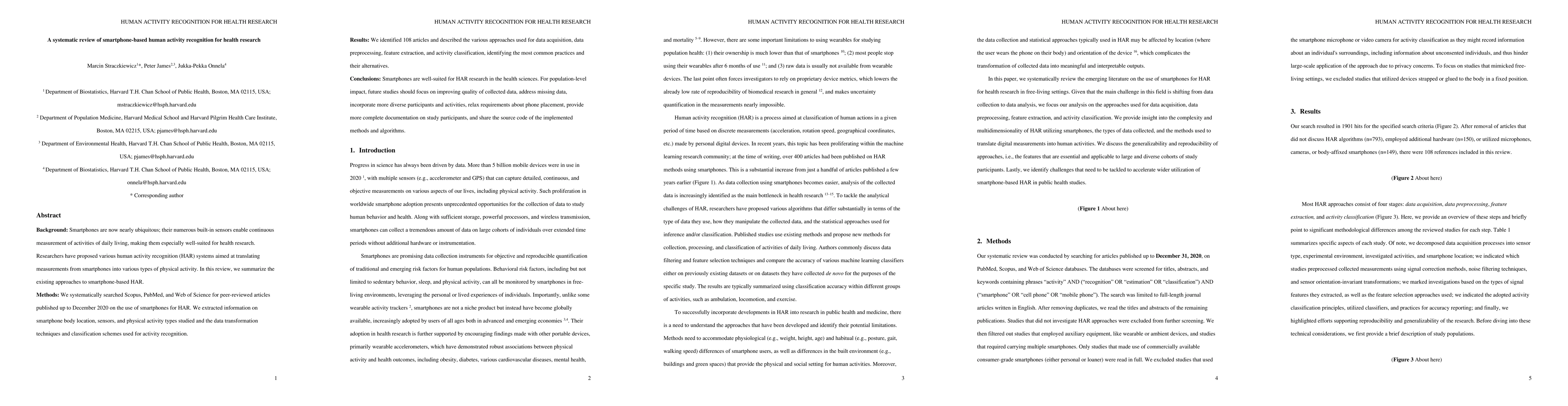 Background: Smartphones are now nearly ubiquitous; their numerous built-in sensors enable continuous measurement of activities of daily living, making them especially well-suited for health research. Researchers have proposed various human activity recognition (HAR) systems aimed at translating measurements from smartphones into various types of physical activity. In this review, we summarize the existing approaches to smartphone-based HAR. Methods: We systematically searched Scopus, PubMed, and Web of Science for peer-reviewed articles published up to December 2020 on the use of smartphones for HAR. We extracted information on smartphone body location, sensors, and physical activity types studied and the data transformation techniques and classification schemes used for activity recognition. Results: We identified 108 articles and described the various approaches used for data acquisition, data preprocessing, feature extraction, and activity classification, identifying the most common practices and their alternatives. Conclusions: Smartphones are well-suited for HAR research in the health sciences. For population-level impact, future studies should focus on improving quality of collected data, address missing data, incorporate more diverse participants and activities, relax requirements about phone placement, provide more complete documentation on study participants, and share the source code of the implemented methods and algorithms.