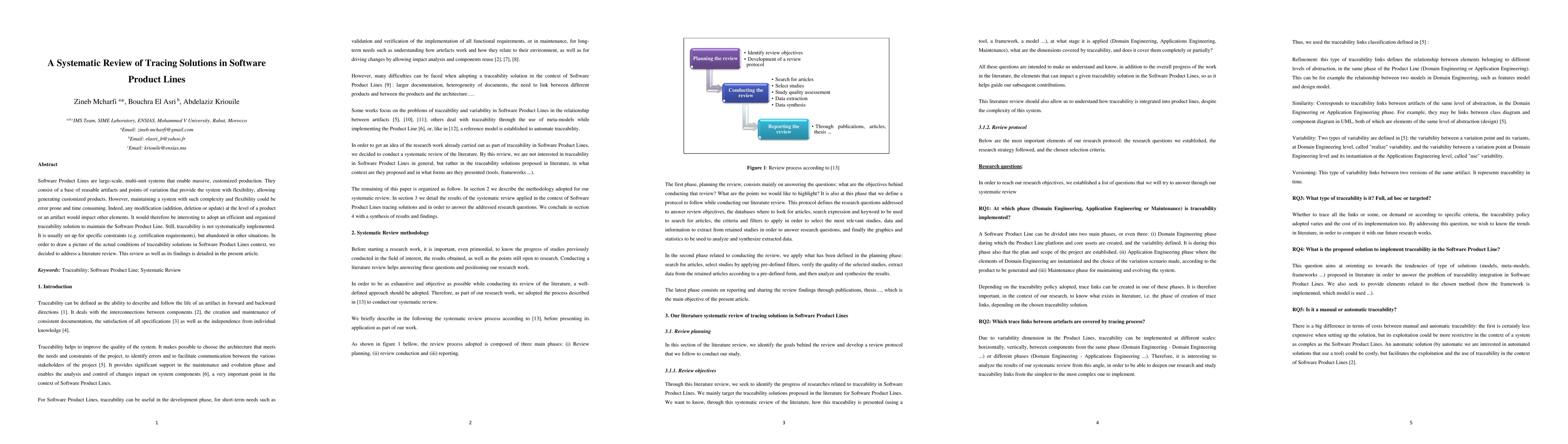 Software Product Lines are large-scale, multi-unit systems that enable massive, customized production. They consist of a base of reusable artifacts and points of variation that provide the system with flexibility, allowing generating customized products. However, maintaining a system with such complexity and flexibility could be error prone and time consuming. Indeed, any modification (addition, deletion or update) at the level of a product or an artifact would impact other elements. It would therefore be interesting to adopt an efficient and organized traceability solution to maintain the Software Product Line. Still, traceability is not systematically implemented. It is usually set up for specific constraints (e.g. certification requirements), but abandoned in other situations. In order to draw a picture of the actual conditions of traceability solutions in Software Product Lines context, we decided to address a literature review. This review as well as its findings is detailed in the present article.