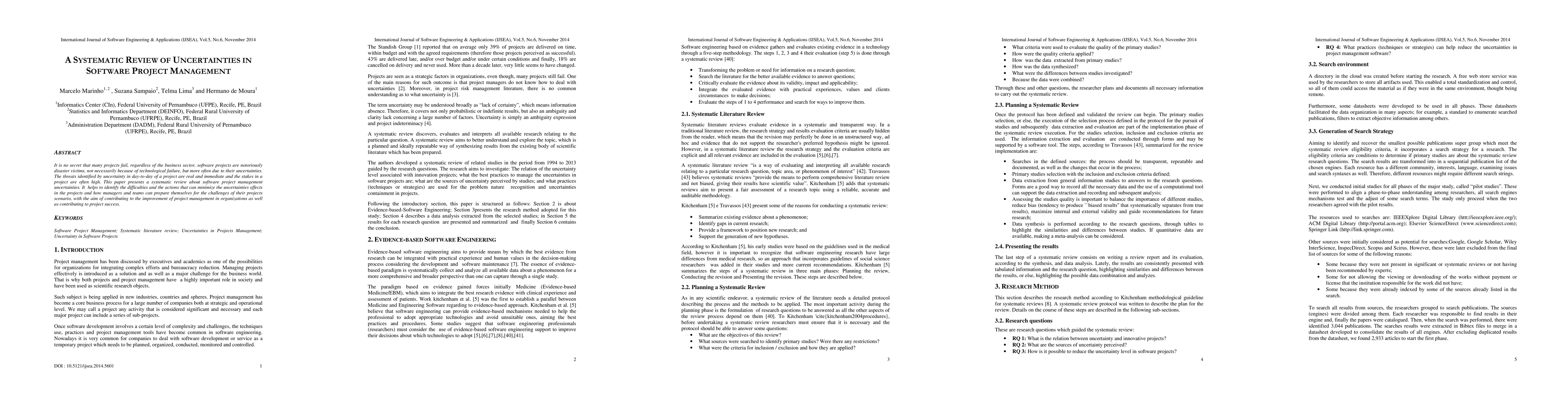 It is no secret that many projects fail, regardless of the business sector, software projects are notoriously disaster victims, not necessarily because of technological failure, but more often due to their uncertainties. The threats identified by uncertainty in day-to-day of a project are real and immediate and the stakes in a project are often high. This paper presents a systematic review about software project management uncertainties. It helps to identify the difficulties and the actions that can minimize the uncertainties effects in the projects and how managers and teams can prepare themselves for the challenges of their projects scenario, with the aim of contributing to the improvement of project management in organizations as well as contributing to project success.
