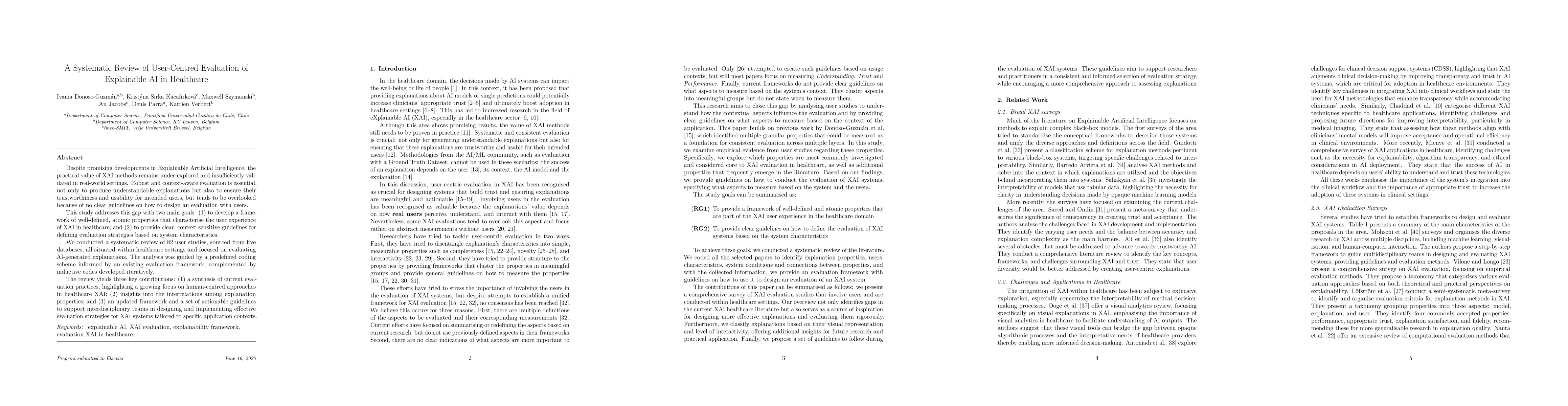 Despite promising developments in Explainable Artificial Intelligence, the practical value of XAI methods remains under-explored and insufficiently validated in real-world settings. Robust and context-aware evaluation is essential, not only to produce understandable explanations but also to ensure their trustworthiness and usability for intended users, but tends to be overlooked because of no clear guidelines on how to design an evaluation with users. This study addresses this gap with two main goals: (1) to develop a framework of well-defined, atomic properties that characterise the user experience of XAI in healthcare; and (2) to provide clear, context-sensitive guidelines for defining evaluation strategies based on system characteristics. We conducted a systematic review of 82 user studies, sourced from five databases, all situated within healthcare settings and focused on evaluating AI-generated explanations. The analysis was guided by a predefined coding scheme informed by an existing evaluation framework, complemented by inductive codes developed iteratively. The review yields three key contributions: (1) a synthesis of current evaluation practices, highlighting a growing focus on human-centred approaches in healthcare XAI; (2) insights into the interrelations among explanation properties; and (3) an updated framework and a set of actionable guidelines to support interdisciplinary teams in designing and implementing effective evaluation strategies for XAI systems tailored to specific application contexts.