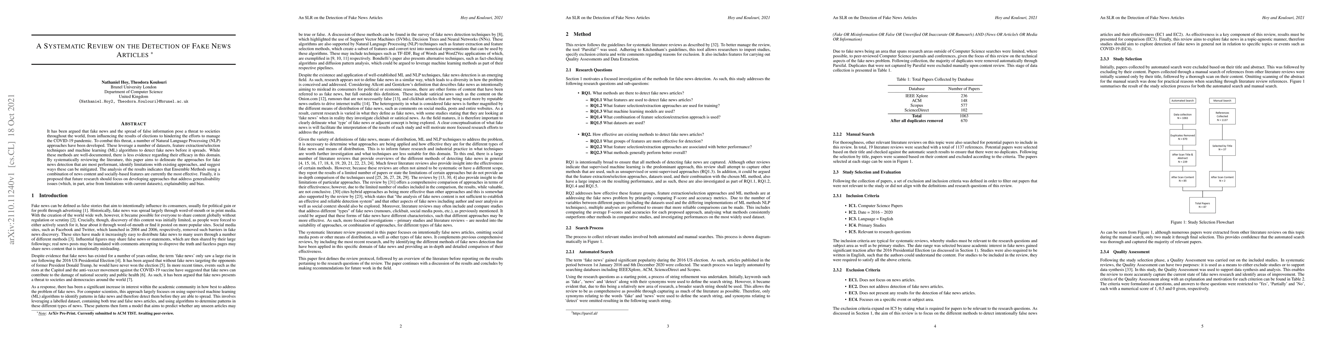 This paper systematically reviews NLP approaches for detecting fake news, highlighting that ensemble methods combining content and social features are most effective. It identifies limitations and suggests future research should focus on improving generalisability, explainability, and reducing bias.