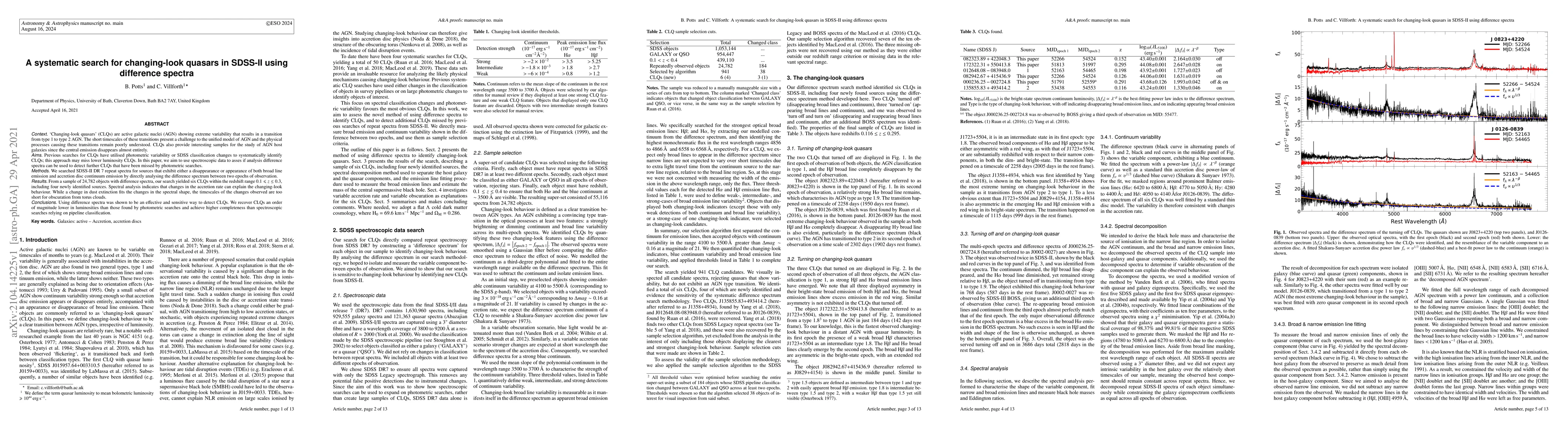 "Changing-look quasars" (CLQs) are active galactic nuclei (AGN) showing extreme variability that results in a transition from Type 1 to Type 2. The short timescales of these transitions present a challenge to the unified model of AGN and the physical processes causing these transitions remain poorly understood. CLQs also provide interesting samples for the study of AGN host galaxies since the central emission disappears almost entirely. Previous searches for CLQs have utilised photometric variability or SDSS classification changes to systematically identify CLQs, this approach may miss lower luminosity CLQs. In this paper, we aim to use spectroscopic data to asses if analysis difference spectra can be used to detect further changing look quasars missed by photometric searches. We search SDSS-II DR 7 repeat spectra for sources that exhibit either a disappearance or appearance of both broad line emission and accretion disk continuum emission by directly analysing the difference spectrum between two epochs of observation. From a sample of 24,782 objects with difference spectra, our search yielded six CLQs within the redshift range $0.1 \leq z \leq 0.3$, including four newly identified sources. Spectral analysis indicates that changes in accretion rate can explain the changing-look behaviour. While a change in dust extinction fits the changes in spectral shape, the time-scales of the changes observed are too short for obscuration from torus clouds. Using difference spectra was shown to be an effective and sensitive way to detect CLQs. We recover CLQs an order of magnitude lower in luminosities than those found by photometric searches and achieve higher completeness than spectroscopic searches relying on pipeline classification.