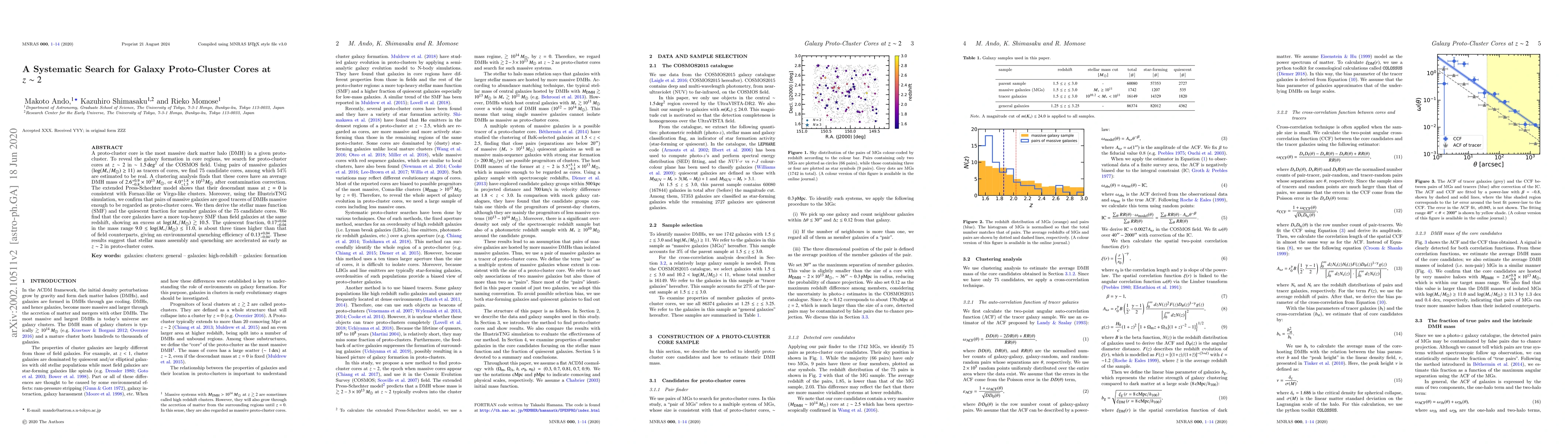 This study identifies galaxy proto-cluster cores at $z\sim 2$ using massive galaxy pairs as tracers, finding 75 candidates with 54% estimated to be real. The analysis reveals that these cores host dark matter halos with masses consistent with future Fornax-like or Virgo-like clusters, and shows that core galaxies exhibit a more top-heavy stellar mass function and a significantly higher quiescent fraction, indicating accelerated stellar mass assembly and quenching.