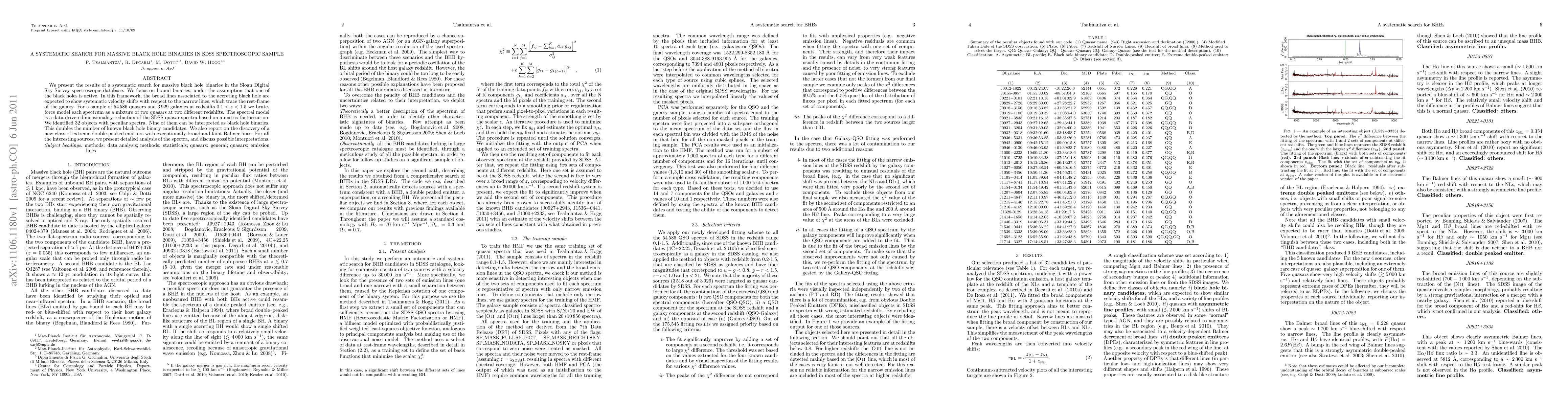 This research systematically searches for massive black hole binaries in the SDSS spectroscopic database, identifying 32 peculiar spectra, nine of which are interpreted as black hole binaries, doubling known candidates. Additionally, a new class of extreme double-peaked emitters with broad and faint Balmer lines is discovered.