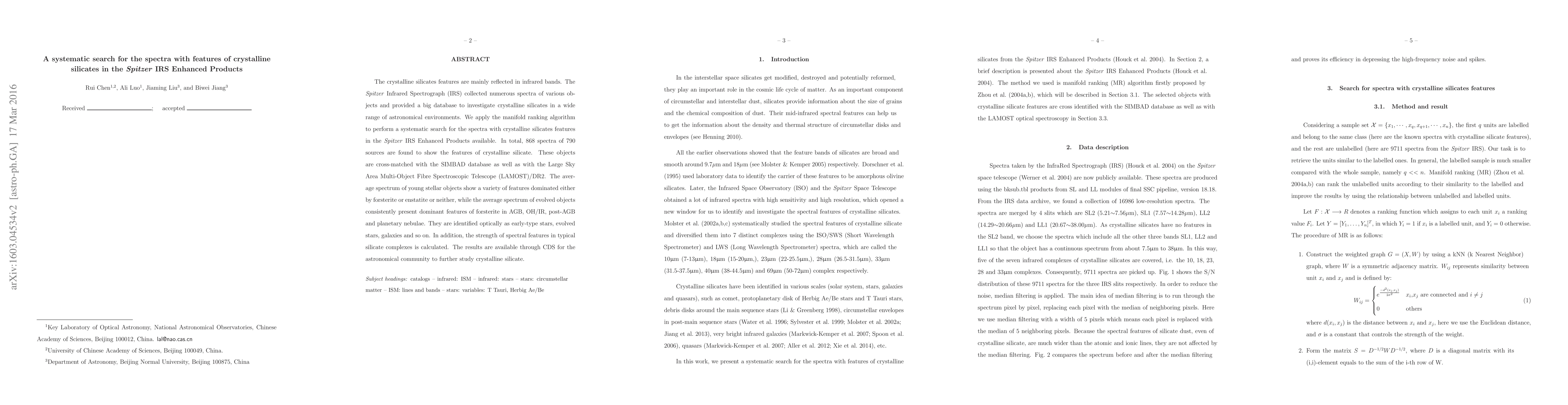 The crystalline silicates features are mainly reflected in infrared bands. The Spitzer Infrared Spectrograph (IRS) collected numerous spectra of various objects and provided a big database to investigate crystalline silicates in a wide range of astronomical environments. We apply the manifold ranking algorithm to perform a systematic search for the spectra with crystalline silicates features in the Spitzer IRS Enhanced Products available. In total, 868 spectra of 790 sources are found to show the features of crystalline silicate. These objects are cross-matched with the SIMBAD database as well as with the Large Sky Area Multi-Object Fibre Spectroscopic Telescope (LAMOST)/DR2. The average spectrum of young stellar objects show a variety of features dominated either by forsterite or enstatite or neither, while the average spectrum of evolved objects consistently present dominant features of forsterite in AGB, OH/IR, post-AGB and planetary nebulae. They are identified optically as early-type stars, evolved stars, galaxies and so on. In addition, the strength of spectral features in typical silicate complexes is calculated. The results are available through CDS for the astronomical community to further study crystalline silicate.