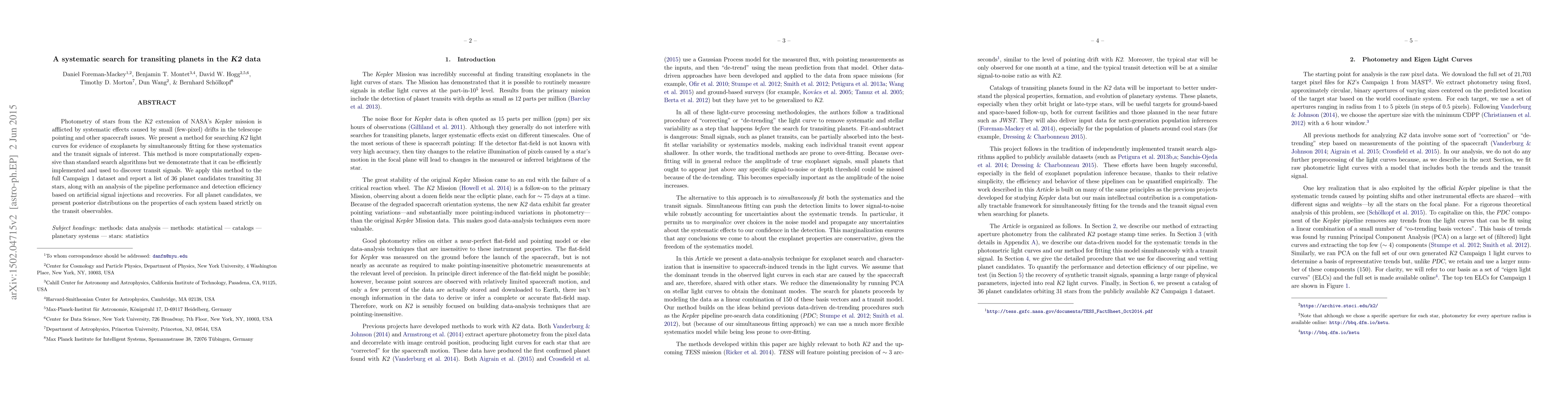 Photometry of stars from the K2 extension of NASA's Kepler mission is afflicted by systematic effects caused by small (few-pixel) drifts in the telescope pointing and other spacecraft issues. We present a method for searching K2 light curves for evidence of exoplanets by simultaneously fitting for these systematics and the transit signals of interest. This method is more computationally expensive than standard search algorithms but we demonstrate that it can be efficiently implemented and used to discover transit signals. We apply this method to the full Campaign 1 dataset and report a list of 36 planet candidates transiting 31 stars, along with an analysis of the pipeline performance and detection efficiency based on artificial signal injections and recoveries. For all planet candidates, we present posterior distributions on the properties of each system based strictly on the transit observables.