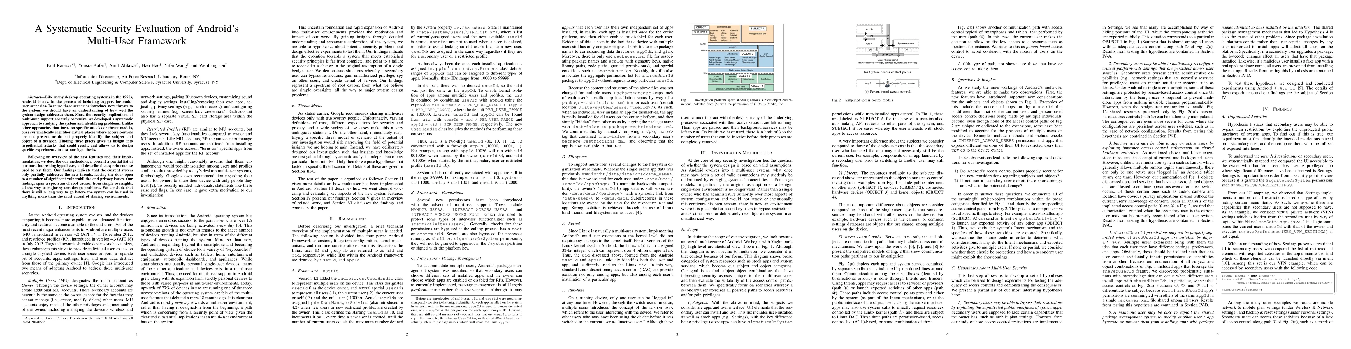 Like many desktop operating systems in the 1990s, Android is now in the process of including support for multi-user scenarios. Because these scenarios introduce new threats to the system, we should have an understanding of how well the system design addresses them. Since the security implications of multi-user support are truly pervasive, we developed a systematic approach to studying the system and identifying problems. Unlike other approaches that focus on specific attacks or threat models, ours systematically identifies critical places where access controls are not present or do not properly identify the subject and object of a decision. Finding these places gives us insight into hypothetical attacks that could result, and allows us to design specific experiments to test our hypothesis. Following an overview of the new features and their implementation, we describe our methodology, present a partial list of our most interesting hypotheses, and describe the experiments we used to test them. Our findings indicate that the current system only partially addresses the new threats, leaving the door open to a number of significant vulnerabilities and privacy issues. Our findings span a spectrum of root causes, from simple oversights, all the way to major system design problems. We conclude that there is still a long way to go before the system can be used in anything more than the most casual of sharing environments.