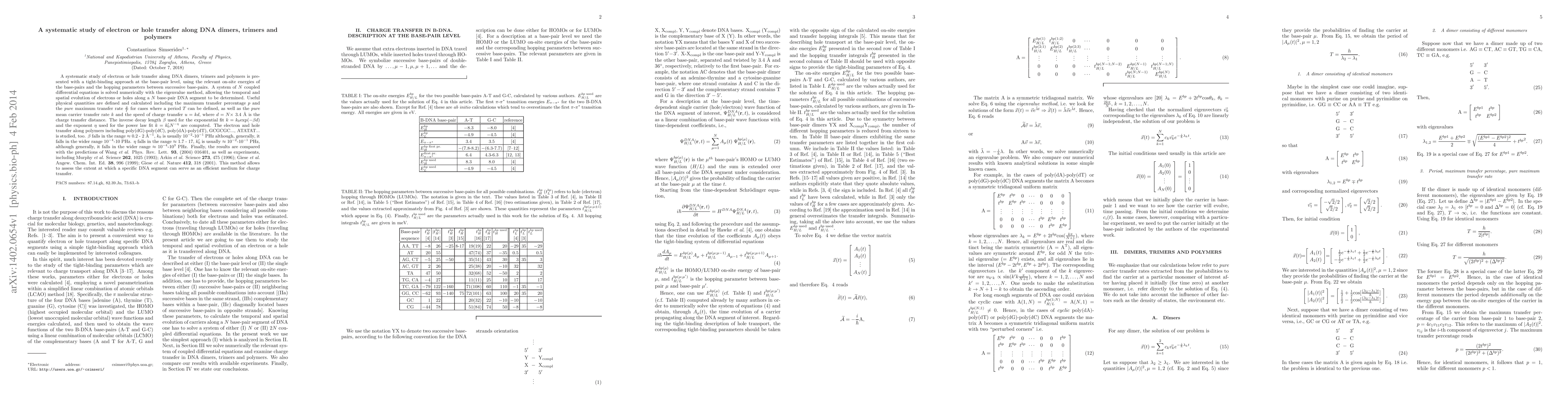A systematic study of electron or hole transfer along DNA dimers, trimers and polymers is presented with a tight-binding approach at the base-pair level, using the relevant on-site energies of the base-pairs and the hopping parameters between successive base-pairs. A system of $N$ coupled differential equations is solved numerically with the eigenvalue method, allowing the temporal and spatial evolution of electrons or holes along a $N$ base-pair DNA segment to be determined. Useful physical quantities are defined and calculated including the maximum transfer percentage $p$ and the pure maximum transfer rate $\frac{p}{T}$ for cases where a period $T$ can be defined, as well as the pure mean carrier transfer rate $k$ and the speed of charge transfer $u=kd$, where $d = N \times$ 3.4 {\AA} is the charge transfer distance. The inverse decay length $\beta$ used for the exponential fit $k = k_0 \exp(-\beta d)$ and the exponent $\eta$ used for the power law fit $k = k_0' N^{-\eta}$ are computed. The electron and hole transfer along polymers including poly(dG)-poly(dC), poly(dA)-poly(dT), GCGCGC..., ATATAT... is studied, too. $\beta$ falls in the range $\approx$ 0.2-2 {\AA}$^{-1}$, $k_0$ is usually 10$^{-2}$-10$^{-1}$ PHz although, generally, it falls in the wider range 10$^{-4}$-10 PHz. $\eta$ falls in the range $\approx$ 1.7-17, $k_0'$ is usually $\approx 10^{-2}$-10$^{-1}$ PHz, although generally, it falls in the wider range $\approx10^{-4}$-10$^3$ PHz. Finally, the results are compared with the predictions of Wang et al. Phys. Rev. Lett. 93, (2004) 016401, as well as experiments, including Murphy et al. Science 262, 1025 (1993); Arkin et al. Science 273, 475 (1996); Giese et al. Angew. Chem. Int. Ed. 38, 996 (1999); Giese et al. Nature 412, 318 (2001). This method allows to assess the extent at which a specific DNA segment can serve as an efficient medium for charge transfer.