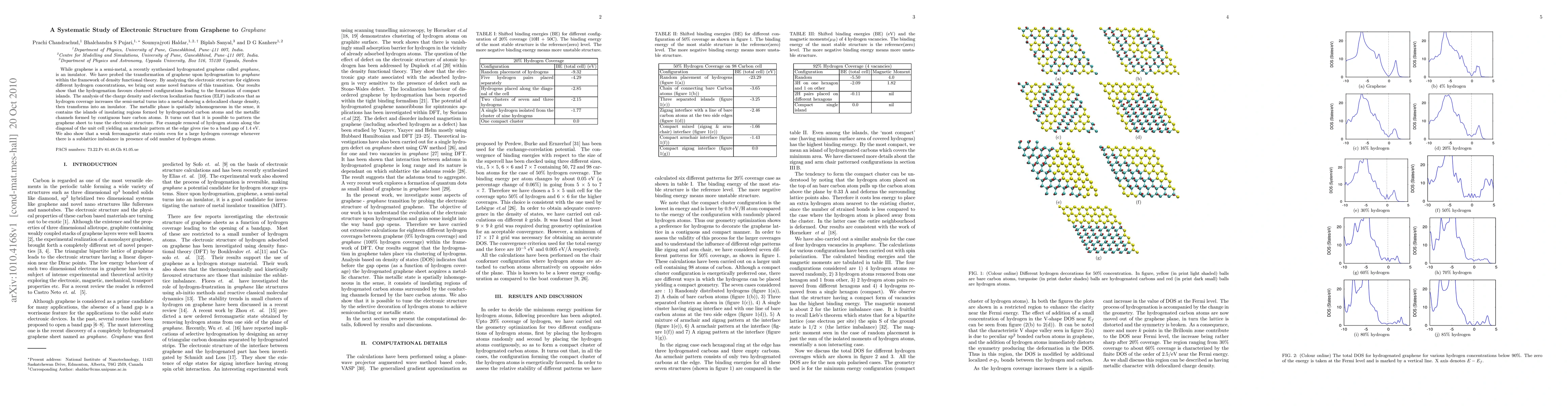 This research systematically investigates the electronic structure transformation from graphene to graphane using density functional theory, revealing that hydrogenation results in a transition from a semi-metal to an insulator, characterized by spatially inhomogeneous metallic phases and the emergence of a band gap and weak ferromagnetism.