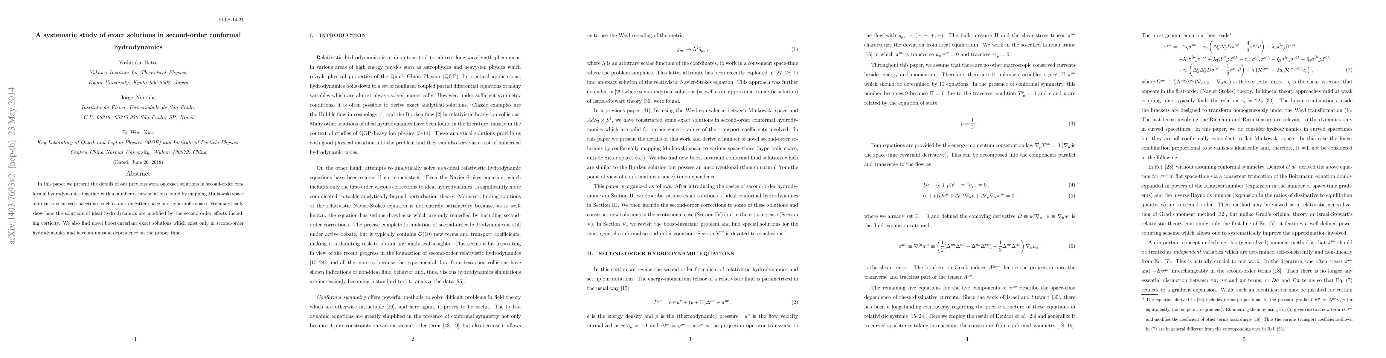 This paper presents new exact solutions in second-order conformal hydrodynamics, found by mapping Minkowski space onto curved spacetimes like anti-de Sitter and hyperbolic space. It demonstrates how second-order effects, including vorticity, modify ideal fluid solutions and introduces boost-invariant solutions unique to second-order hydrodynamics with unconventional proper time dependence.