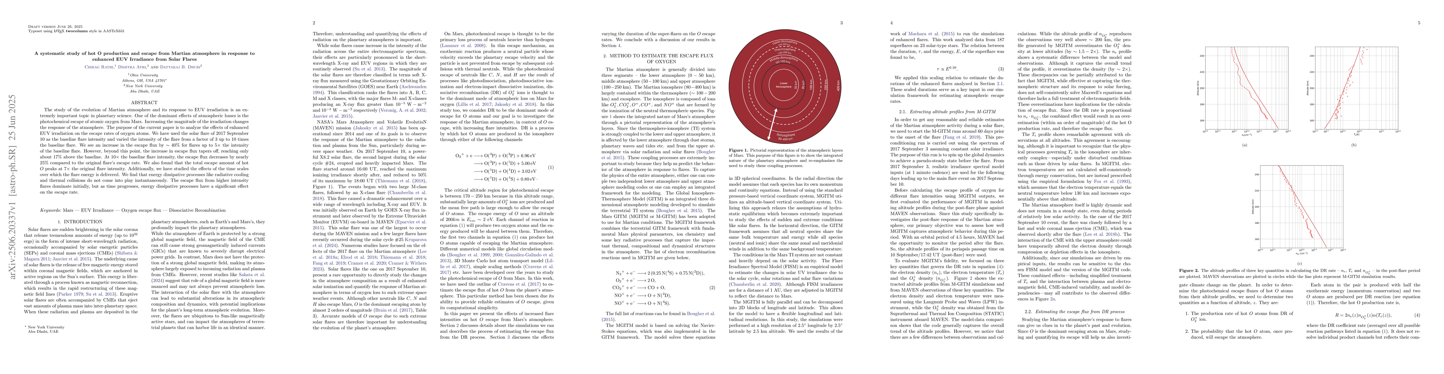 The study of the evolution of Martian atmosphere and its response to EUV irradiation is an extremely important topic in planetary science. One of the dominant effects of atmospheric losses is the photochemical escape of atomic oxygen from Mars. Increasing the magnitude of the irradiation changes the response of the atmosphere. The purpose of the current paper is to analyze the effects of enhanced EUV irradiation on the escape rates of oxygen atoms. We have used the solar flare of 2017 September 10 as the baseline flare intensity and varied the intensity of the flare from a factor of 3 up to 10 times the baseline flare. We see an increase in the escape flux by 40% for flares up to 5x the intensity of the baseline flare. However, beyond this point, the increase in escape flux tapers off, reaching only about 17% above the baseline. At 10x the baseline flare intensity, the escape flux decreases by nearly 25% compared to the escape rate of the original flare. We also found that the total escape amount of hot O peaks at 7x the original flare intensity. Additionally, we have studied the effects of the time scales over which the flare energy is delivered. We find that energy dissipative processes like radiative cooling and thermal collisions do not come into play instantaneously. The escape flux from higher intensity flares dominate initially, but as time progresses, energy dissipative processes have a significant effect on the escape rate.