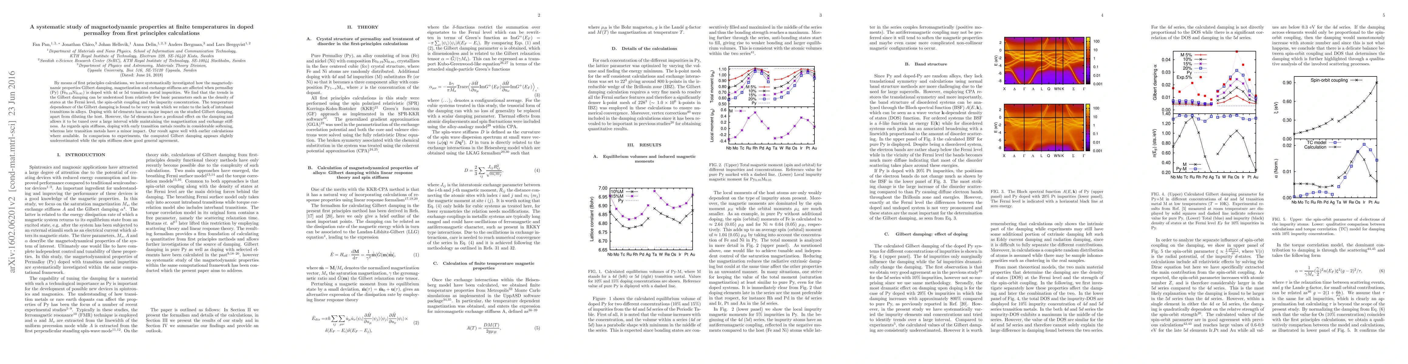 This study uses first principles calculations to explore how doping permalloy with 4d or 5d transition metals affects its magnetodynamic properties, finding that 5d doping significantly tunes Gilbert damping while 4d doping has minimal impact. The temperature dependence of Gilbert damping is weak due to the lack of intraband transitions in alloys.