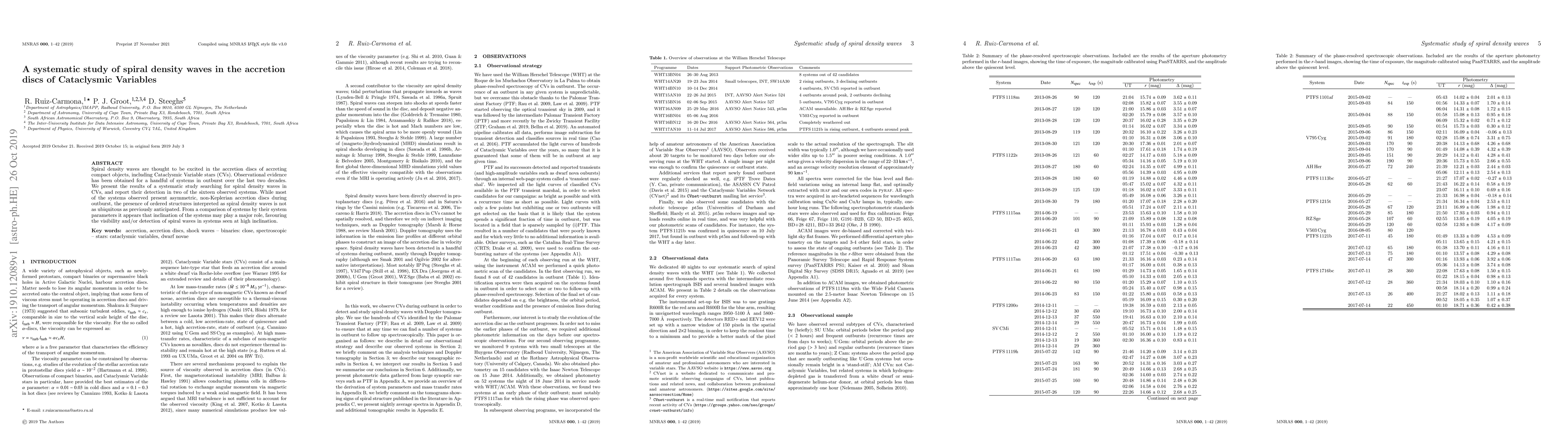 Spiral density waves are thought to be excited in the accretion discs of accreting compact objects, including Cataclysmic Variable stars (CVs). Observational evidence has been obtained for a handful of systems in outburst over the last two decades. We present the results of a systematic study searching for spiral density waves in CVs, and report their detection in two of the sixteen observed systems. While most of the systems observed present asymmetric, non-Keplerian accretion discs during outburst, the presence of ordered structures interpreted as spiral density waves is not as ubiquitous as previously anticipated. From a comparison of systems by their system parameters it appears that inclination of the systems may play a major role, favouring the visibility and/or detection of spiral waves in systems seen at high inclination.